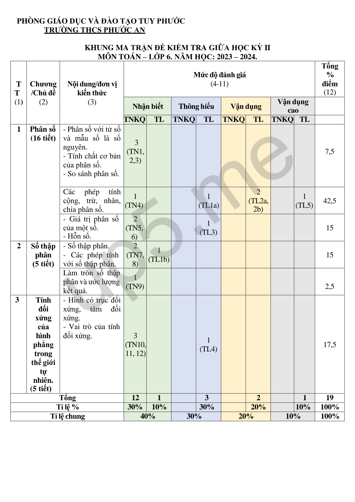 ĐỀ KIỂM TRA GIỮA HỌC KỲ II MÔN: TOÁN 6 NĂM HỌC: 2023-2024 |