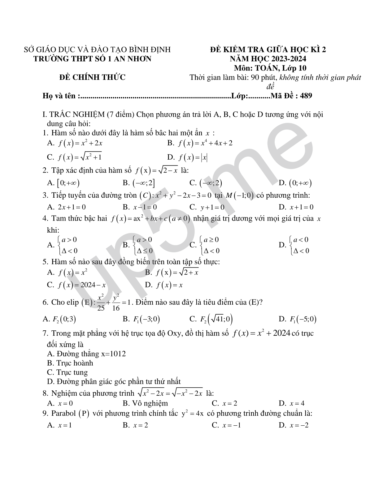 ĐỀ KIỂM TRA GIỮA HỌC KÌ 2NĂM HỌC 2023-2024 Môn: TOÁN, Lớp 10 Thời gian làm bài: 90 phút, không tính thời gian phát đề |