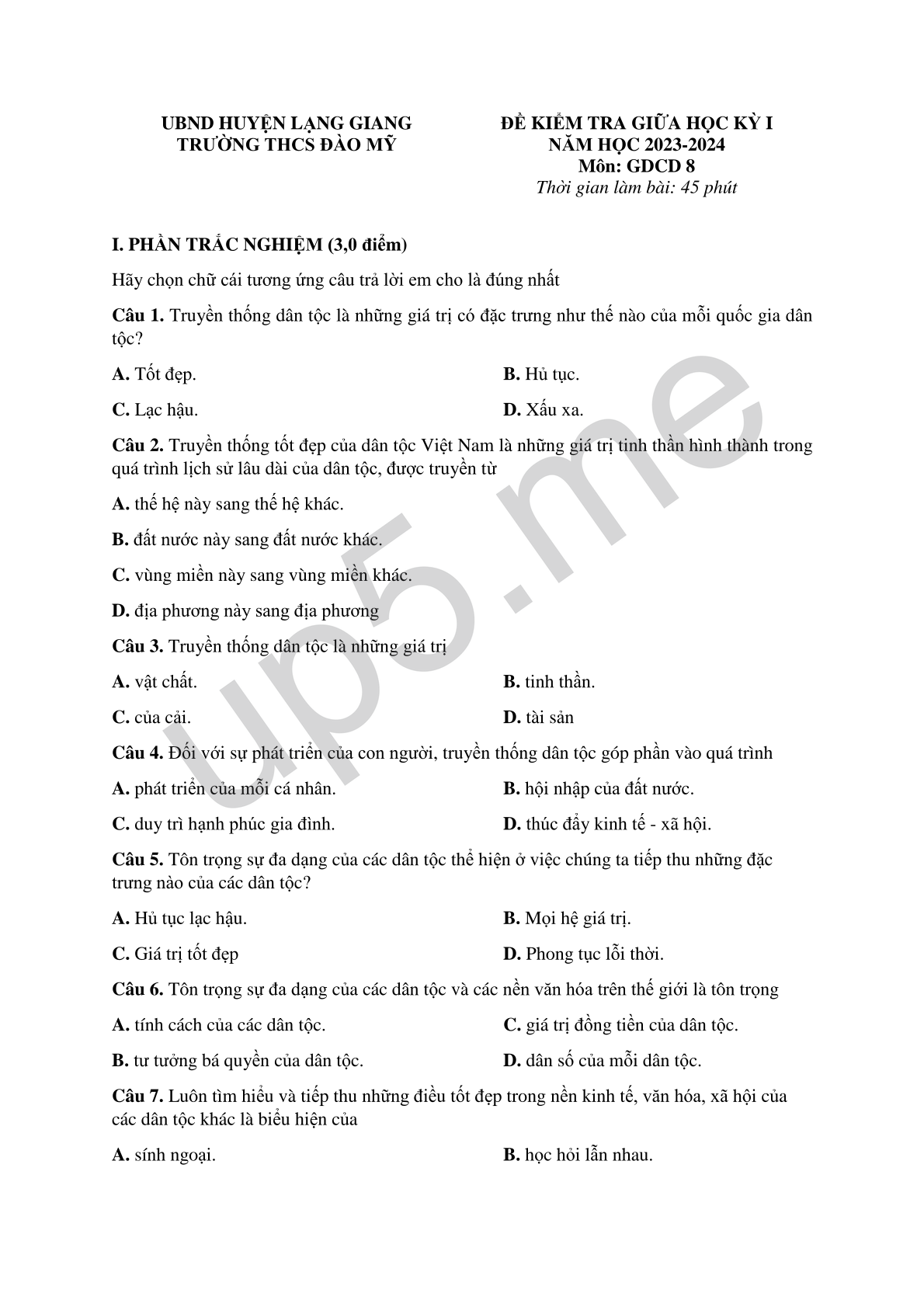 ĐỀ KIỂM TRA GIỮA HỌC KỲ INĂM HỌC 2023-2024Môn: GDCD 8Thời gian làm bài: 45 phút |