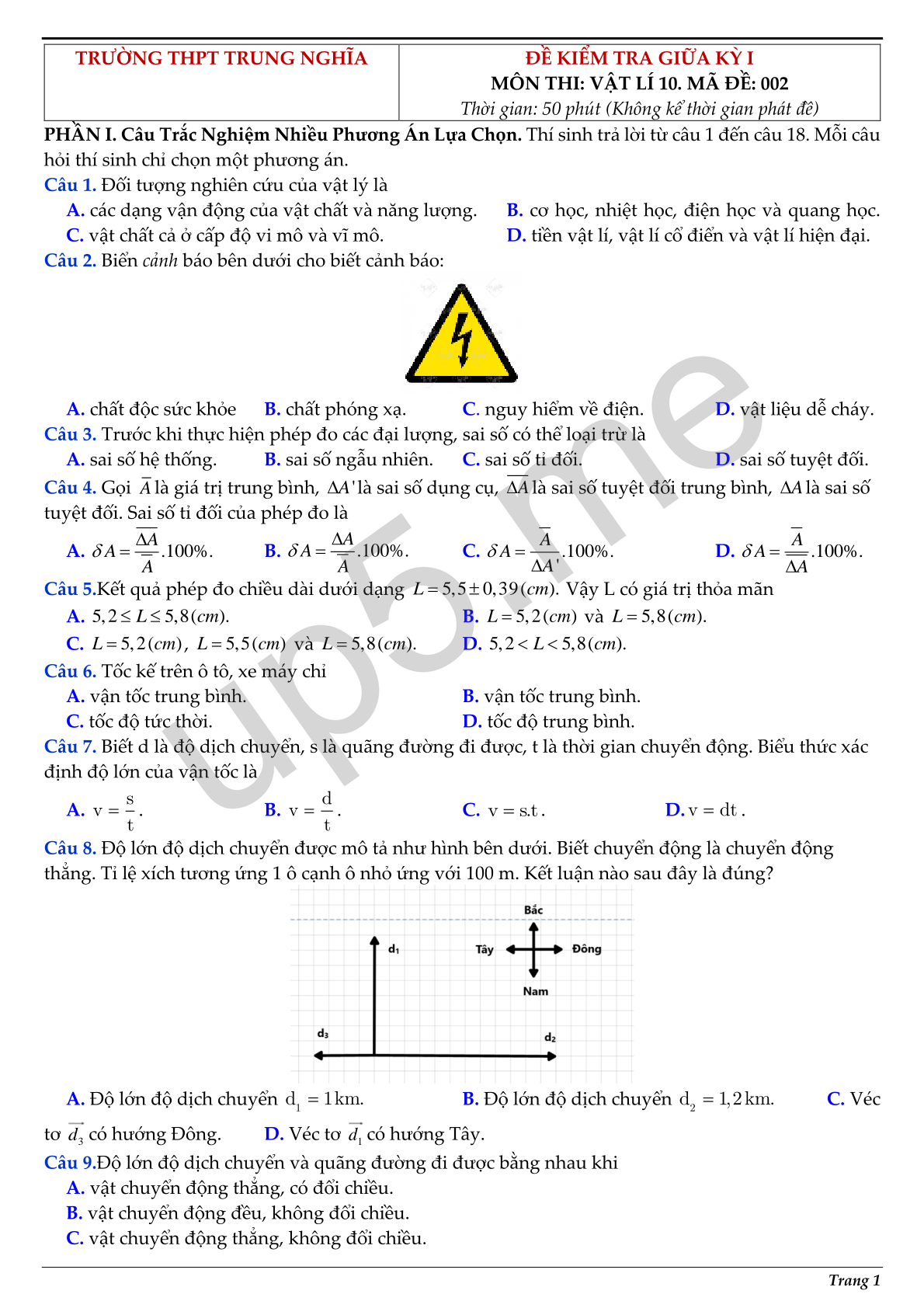 MÔN THI: VẬT LÍ 10. MÃ ĐỀ: 002