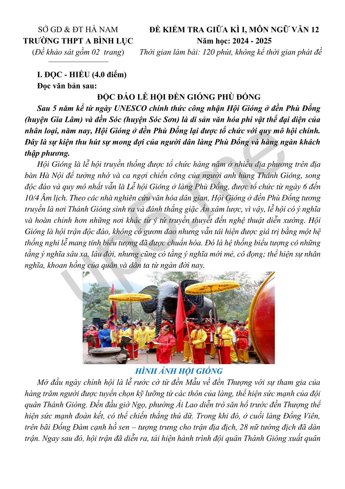 ĐỀ KIỂM TRA GIỮA KÌ I, MÔN NGỮ VĂN 12 Năm học: 2024 - 2025 Thời gian làm bài: 120 phút, không kể thời gian phát đề |