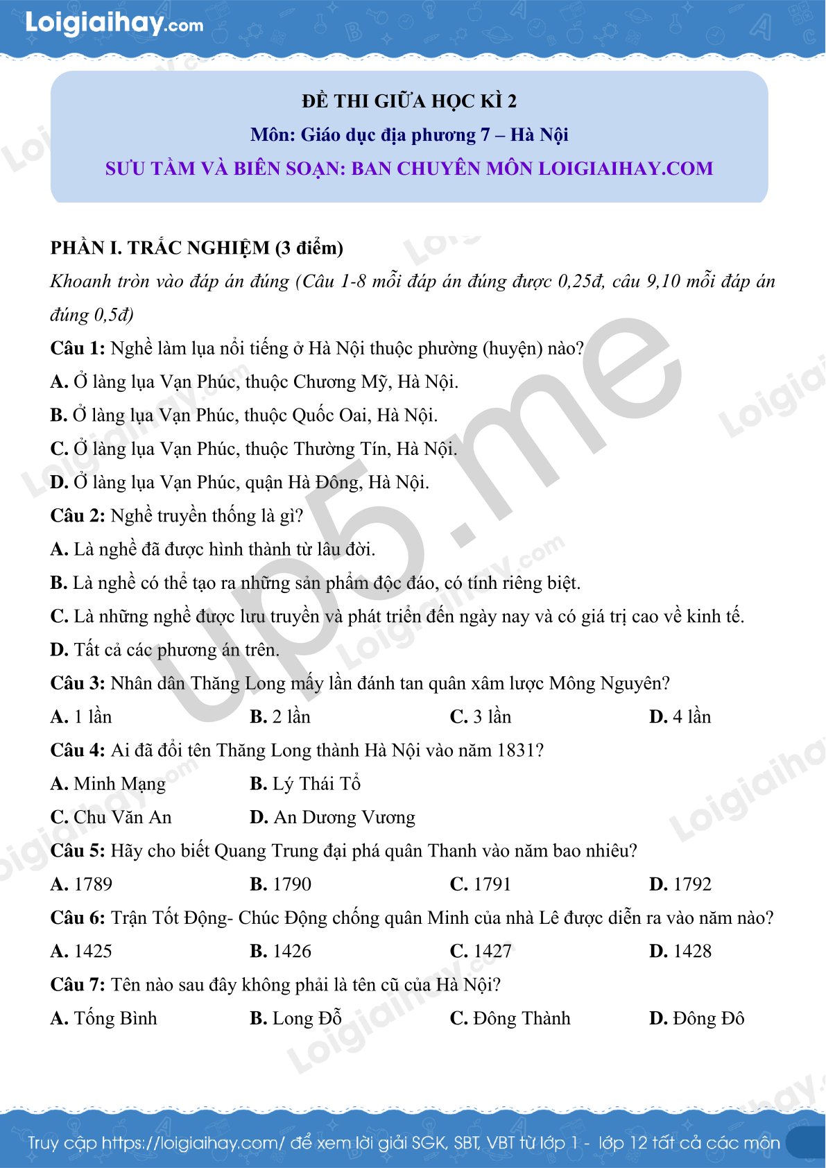 Môn: Giáo dục địa phương 7 – Hà Nội