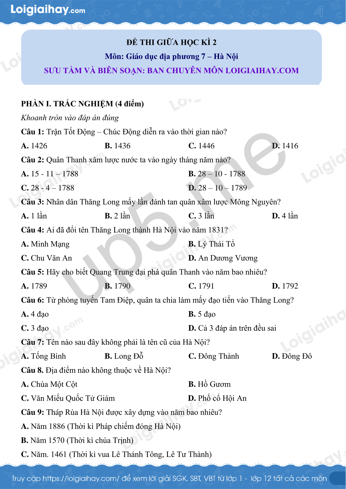 Môn: Giáo dục địa phương 7 – Hà Nội