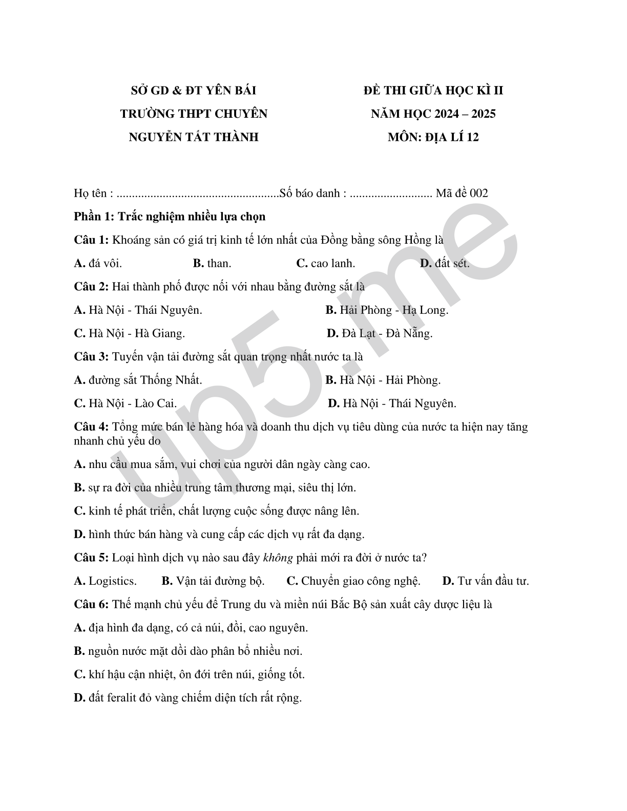| SỞ GD & ĐT YÊN BÁITRƯỜNG THPT CHUYÊNNGUYỄN TẤT THÀNH | ĐỀ THI GIỮA HỌC KÌ IINĂM HỌC 2024 – 2025MÔN: ĐỊA LÍ 12 |