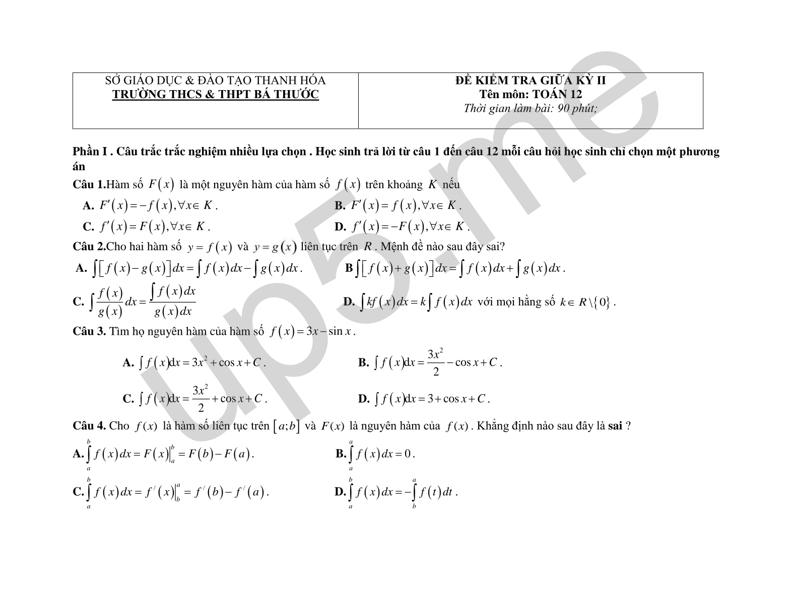 ĐỀ KIỂM TRA GIỮA KỲ II Tên môn: TOÁN 12 Thời gian làm bài: 90 phút |