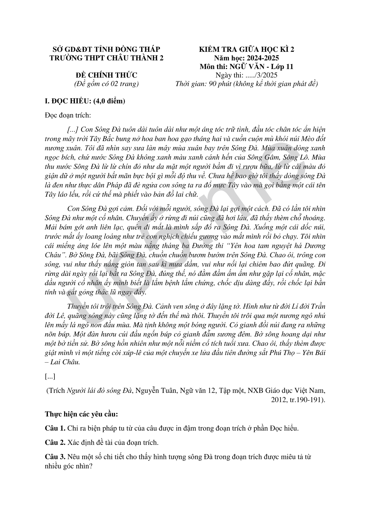 | SỞ GD&ĐT TỈNH ĐỒNG THÁPTRƯỜNG THPT CHÂU THÀNH 2ĐỀ CHÍNH THỨC(Đề gồm có 02 trang) | KIỂM TRA GIỮA HỌC KÌ 2Năm học: 2024-2025Môn thi: NGỮ VĂN - Lớp 11Ngày thi: ...../3/2025Thời gian: 90 phút (không kể thời gian phát đề) |