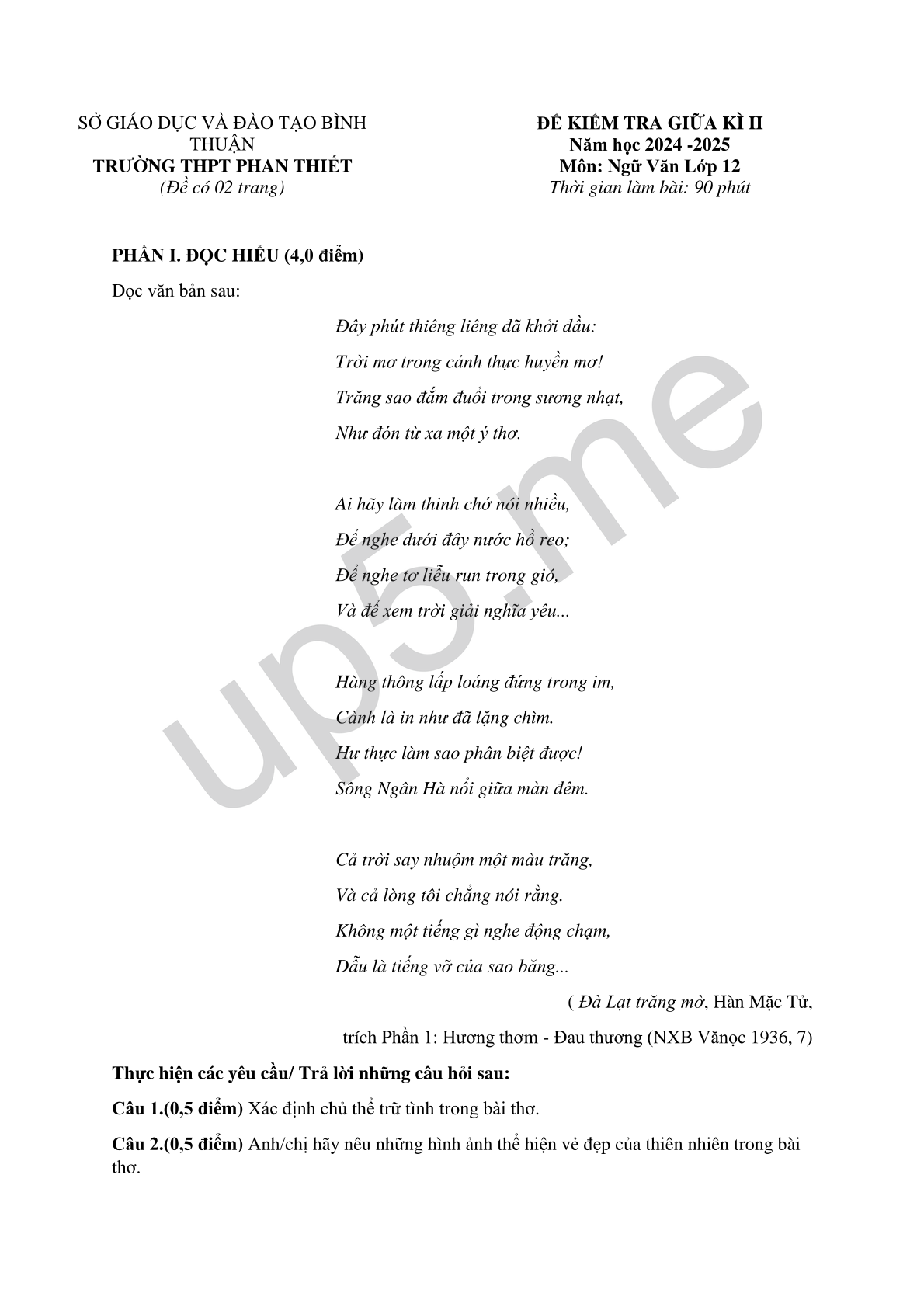 | SỞ GIÁO DỤC VÀ ĐÀO TẠO BÌNH THUẬNTRƯỜNG THPT PHAN THIẾT(Đề có 02 trang) | ĐỂ KIỂM TRA GIỮA KÌ IINăm học 2024 -2025Môn: Ngữ Văn Lớp 12Thời gian làm bài: 90 phút |