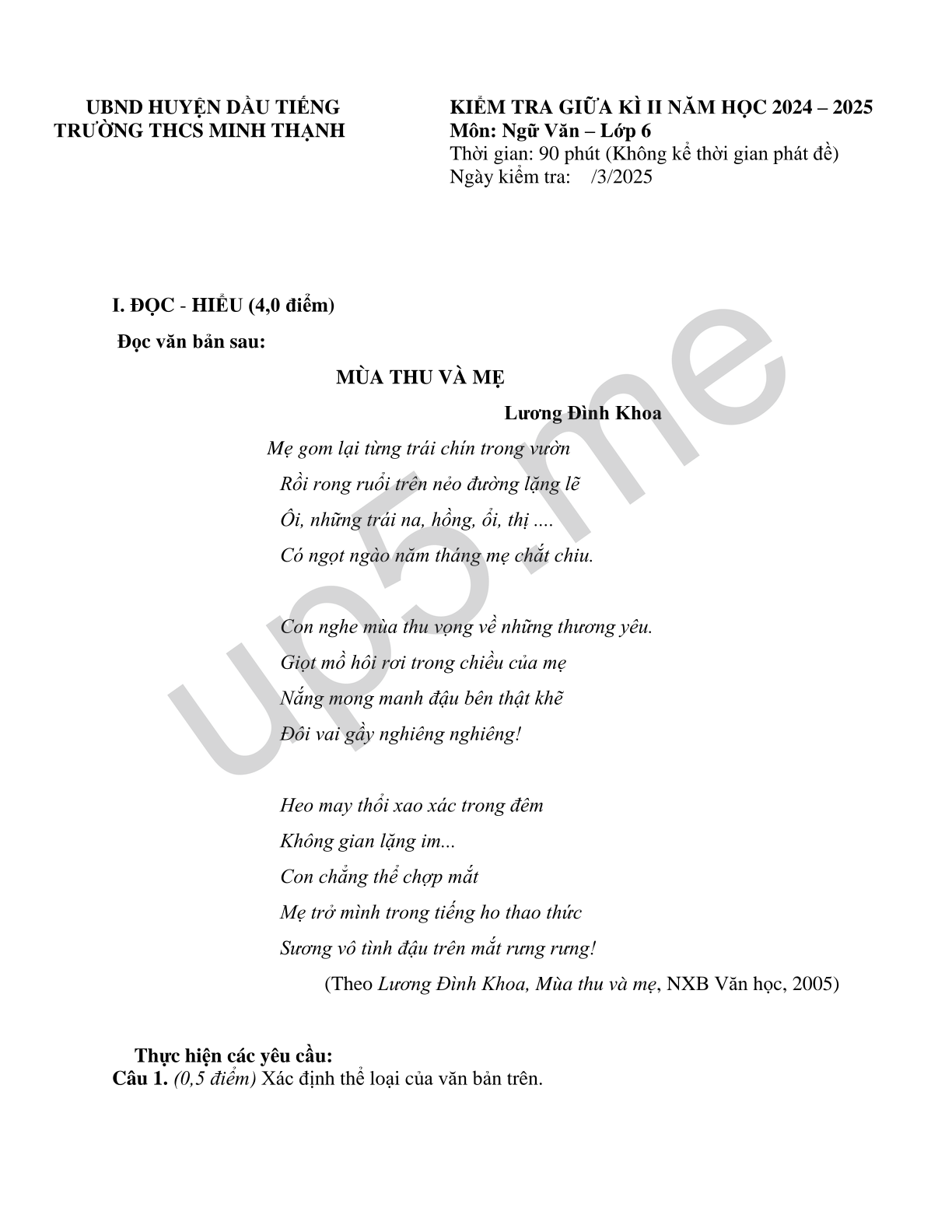 | UBND HUYỆN DẦU TIẾNG TRƯỜNG THCS MINH THẠNH | KIỂM TRA GIỮA KÌ II NĂM HỌC 2024 – 2025 Môn: Ngữ Văn – Lớp 6 Thời gian: 90 phút (Không kể thời gian phát đề) Ngày kiểm tra: /3/2025 |