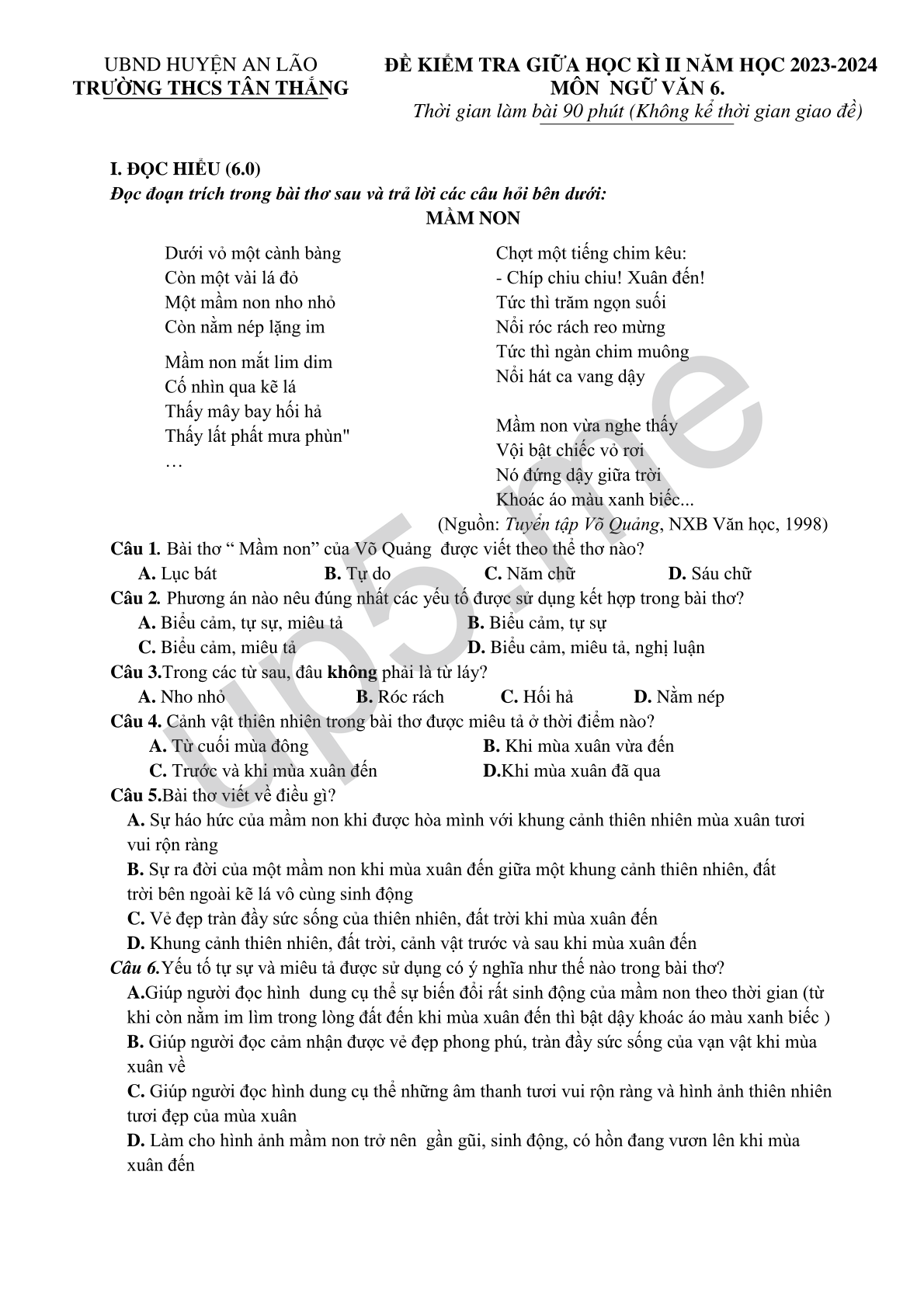 Câu 1. Bài thơ “ Mầm non” của Võ Quảng được viết theo thể thơ nào?