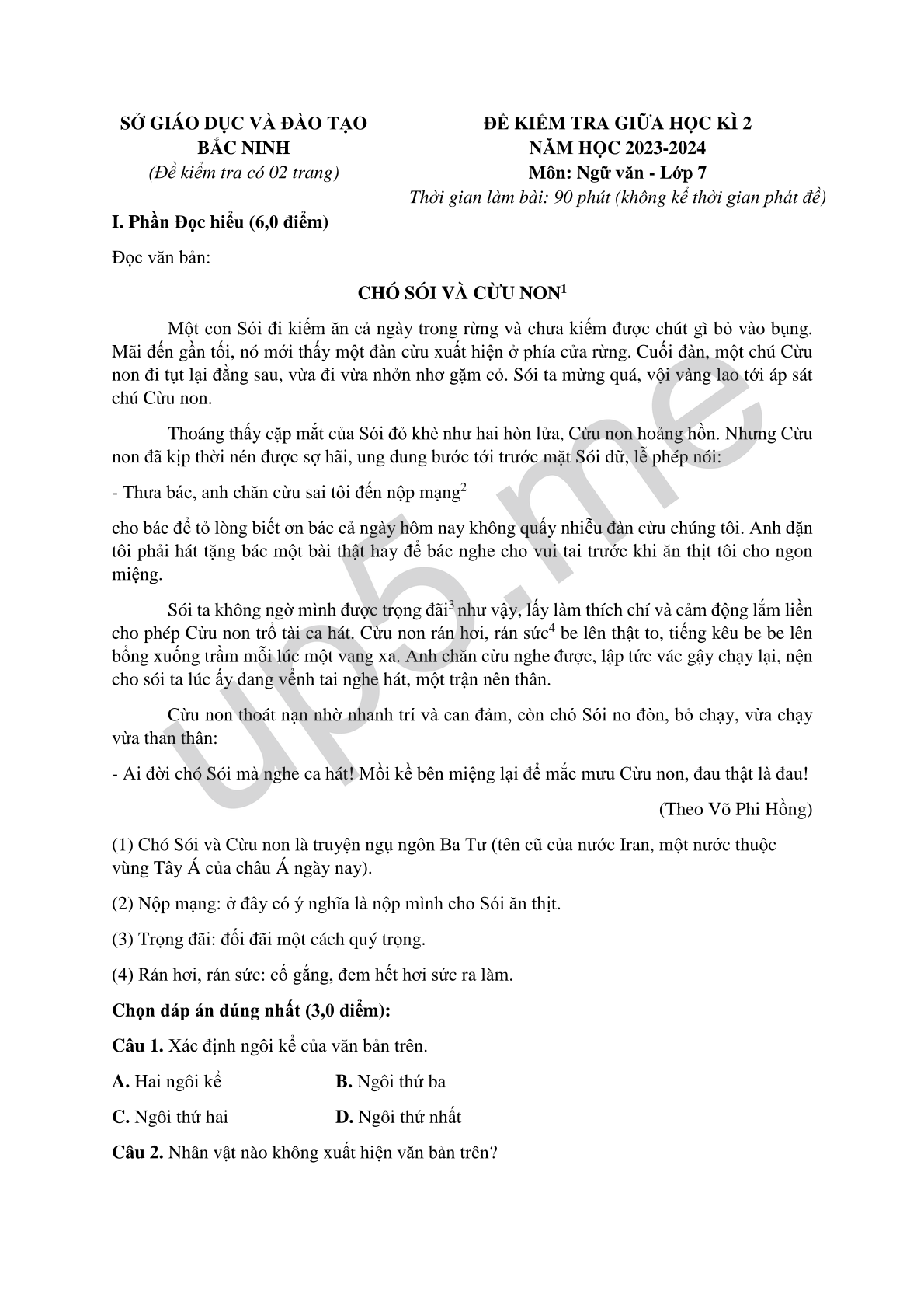 ĐỀ KIỂM TRA GIỮA HỌC KÌ 2 NĂM HỌC 2023-2024 Môn: Ngữ văn - Lớp 7 Thời gian làm bài: 90 phút (không kể thời gian phát đề) |