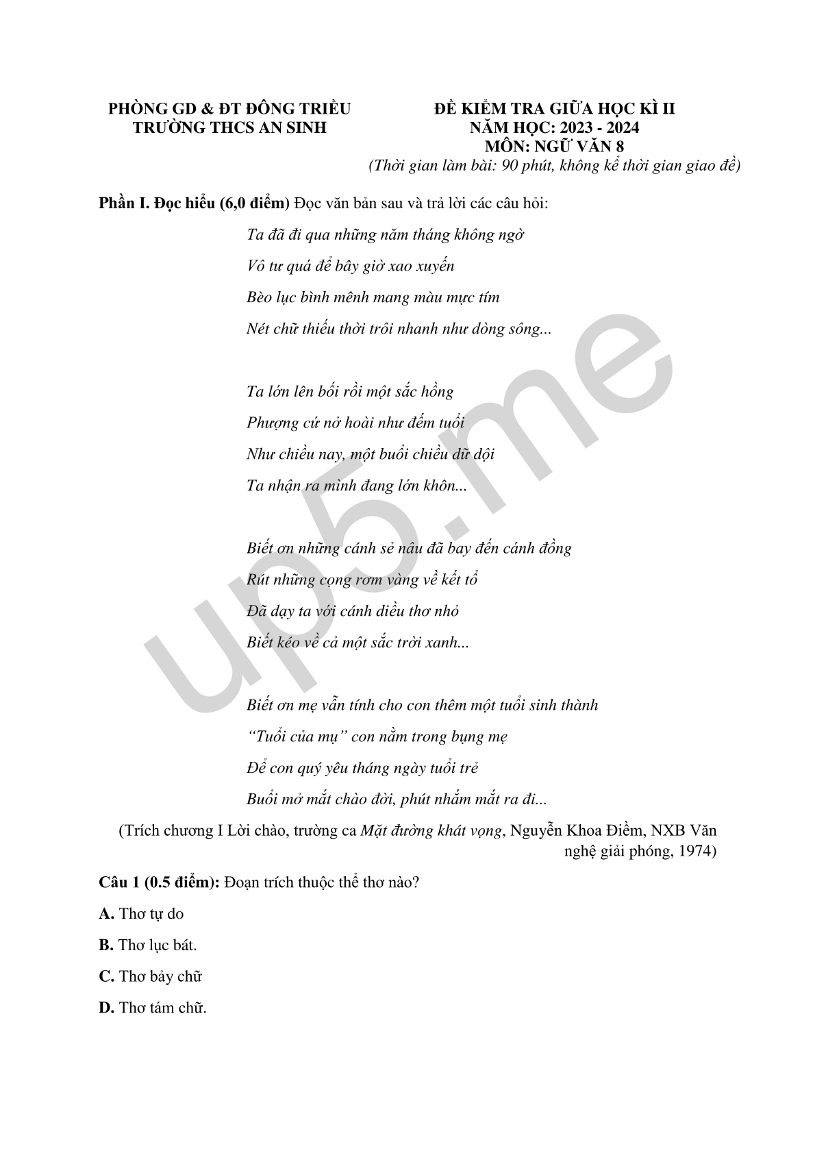ĐỀ KIỂM TRA GIỮA HỌC KÌ IINĂM HỌC: 2023 - 2024MÔN: NGỮ VĂN 8(Thời gian làm bài: 90 phút, không kể thời gian giao đề) |