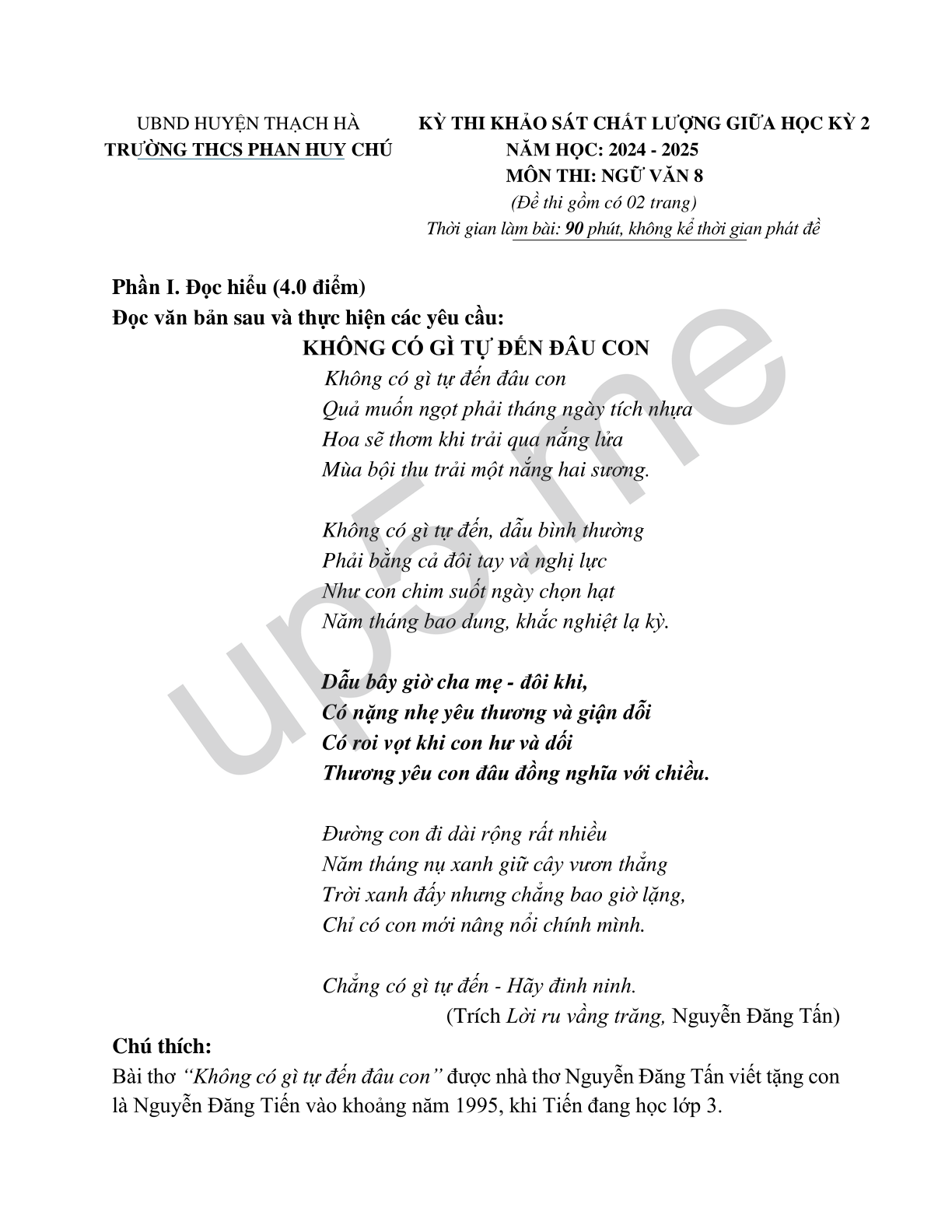 | UBND HUYỆN THẠCH HÀTRƯỜNG THCS PHAN HUY CHÚ | KỲ THI KHẢO SÁT CHẤT LƯỢNG GIỮA HỌC KỲ 2 NĂM HỌC: 2024 - 2025 MÔN THI: NGỮ VĂN 8 (Đề thi gồm có 02 trang)Thời gian làm bài: 90 phút, không kể thời gian phát đề |