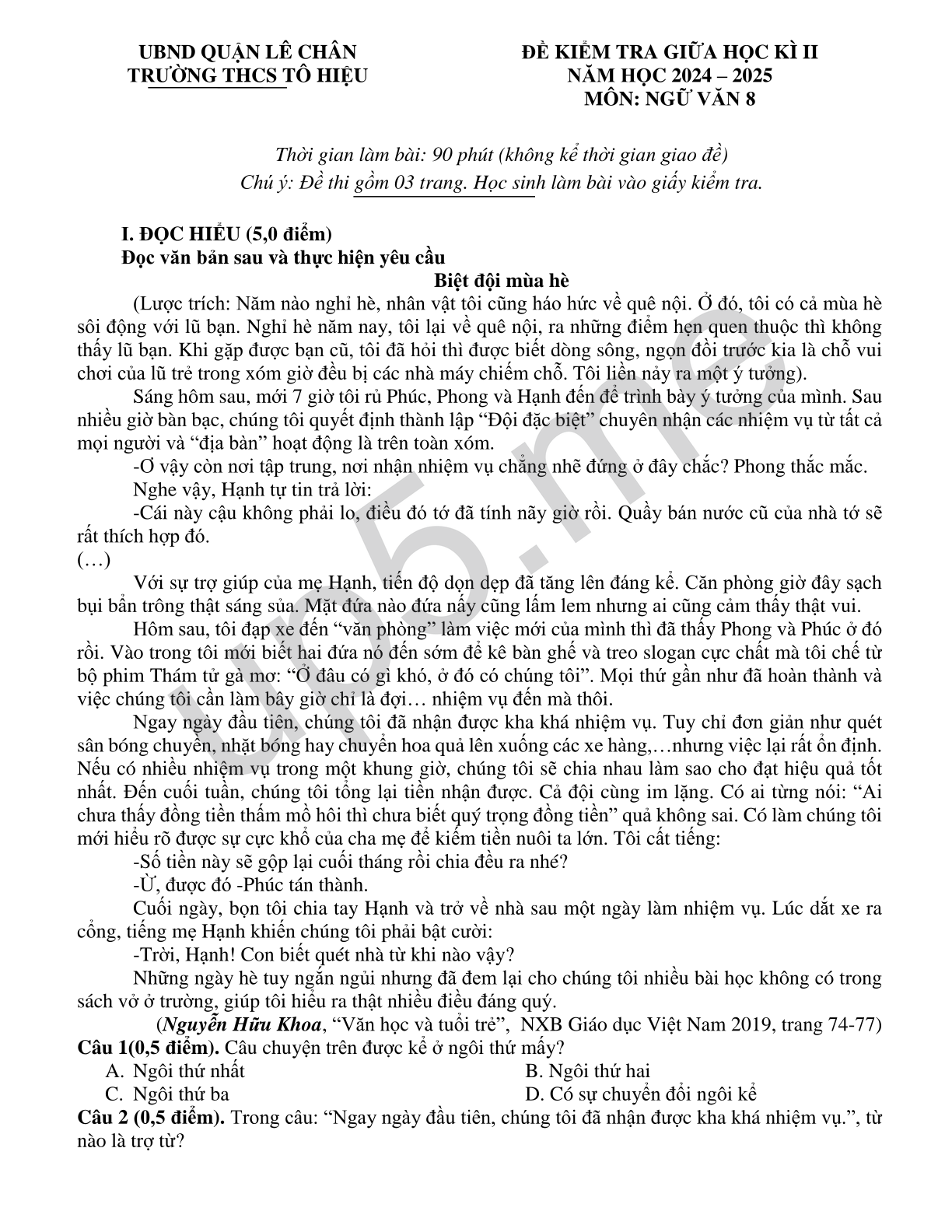 ĐỀ KIỂM TRA GIỮA HỌC KÌ IINĂM HỌC 2024 – 2025MÔN: NGỮ VĂN 8 |