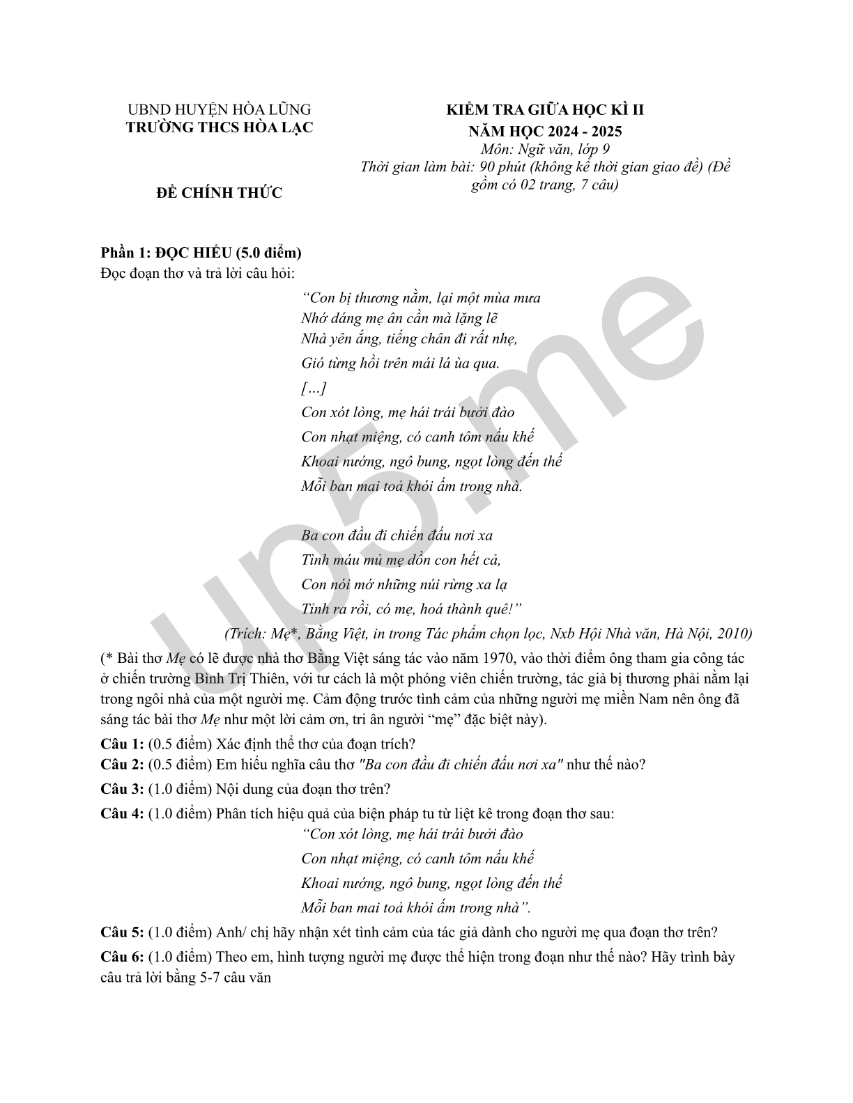 | UBND HUYỆN HÒA LŨNG TRƯỜNG THCS HÒA LẠCĐỀ CHÍNH THỨC |