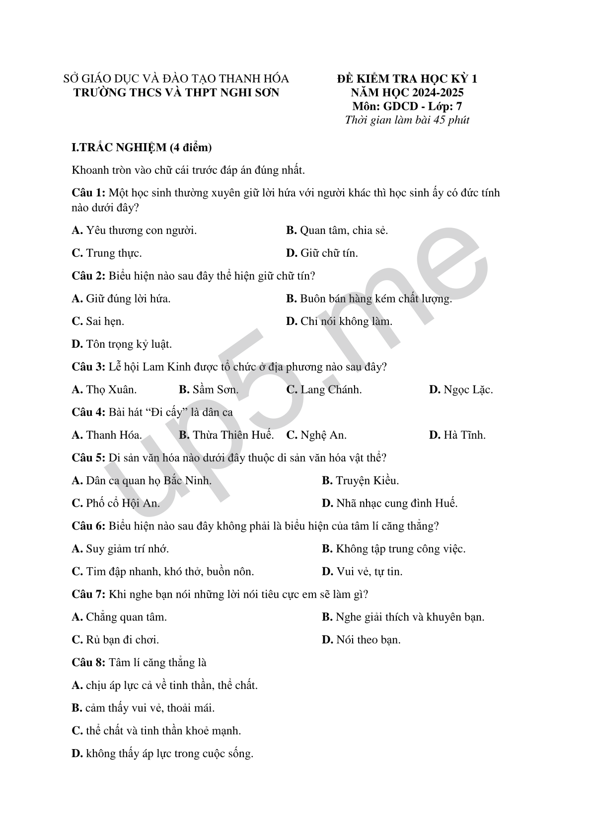 | SỞ GIÁO DỤC VÀ ĐÀO TẠO THANH HÓATRƯỜNG THCS VÀ THPT NGHI SƠN | ĐỀ KIỂM TRA HỌC KỲ 1NĂM HỌC 2024-2025Môn: GDCD - Lớp: 7Thời gian làm bài 45 phút |