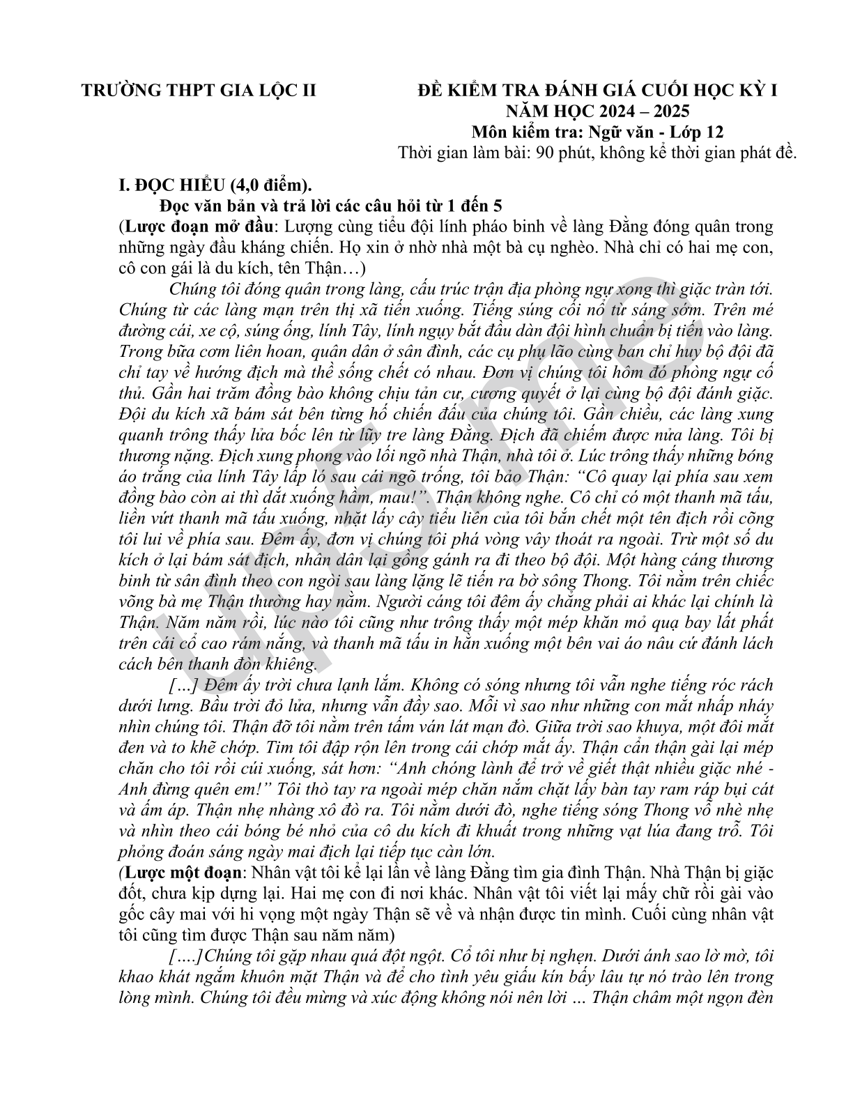 ĐỀ KIỂM TRA ĐÁNH GIÁ CUỐI HỌC KỲ INĂM HỌC 2024 – 2025Môn kiểm tra: Ngữ văn - Lớp 12Thời gian làm bài: 90 phút, không kể thời gian phát đề. |