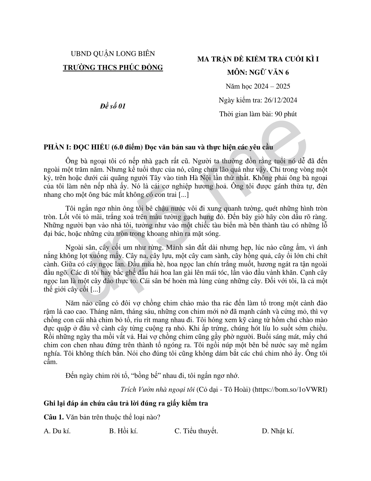 PHẦN I: ĐỌC HIỂU (6.0 điểm) Đọc văn bản sau và thực hiện các yêu cầu