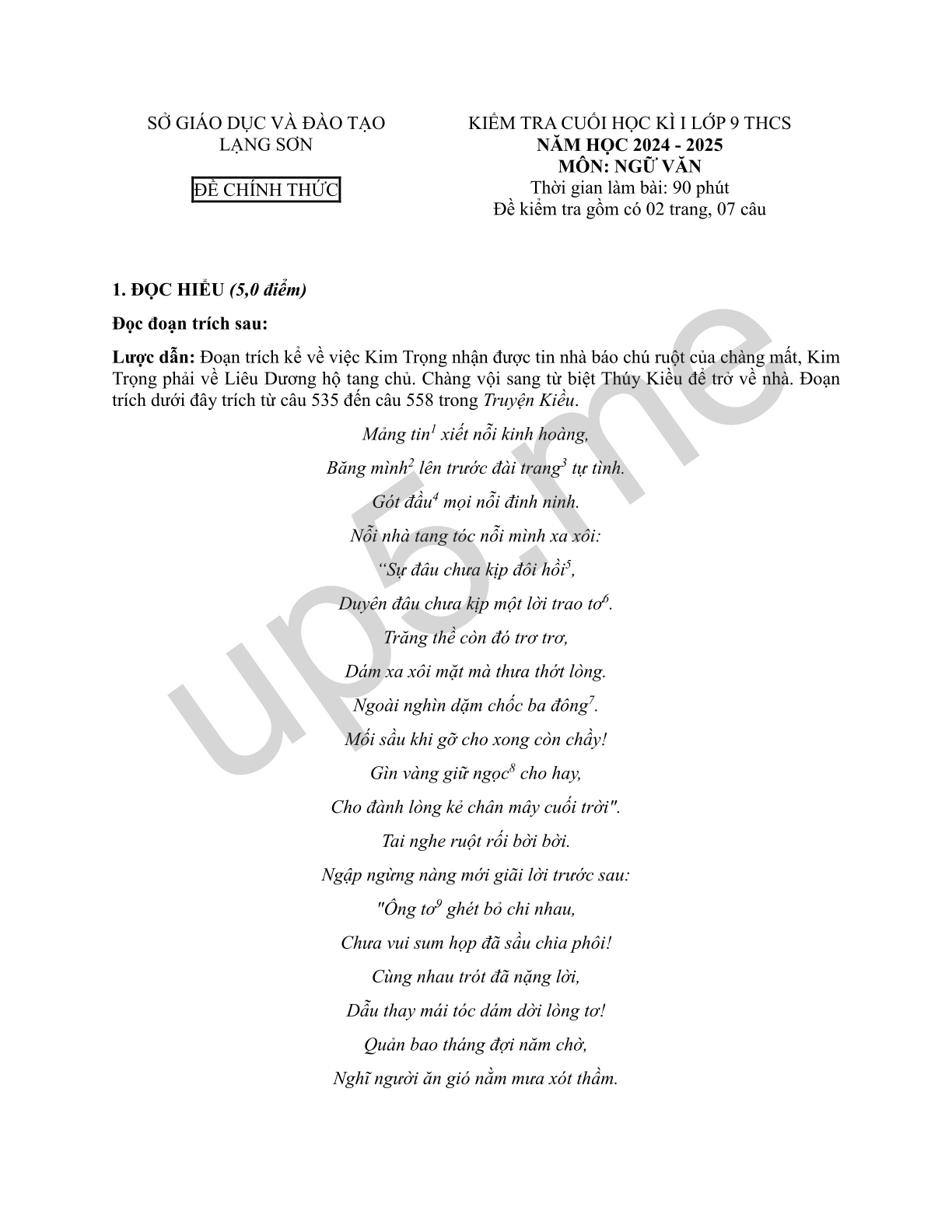 | SỞ GIÁO DỤC VÀ ĐÀO TẠO LẠNG SƠNĐỀ CHÍNH THỨC | KIỂM TRA CUỐI HỌC KÌ I LỚP 9 THCSNĂM HỌC 2024 - 2025MÔN: NGỮ VĂNThời gian làm bài: 90 phútĐề kiểm tra gồm có 02 trang, 07 câu |