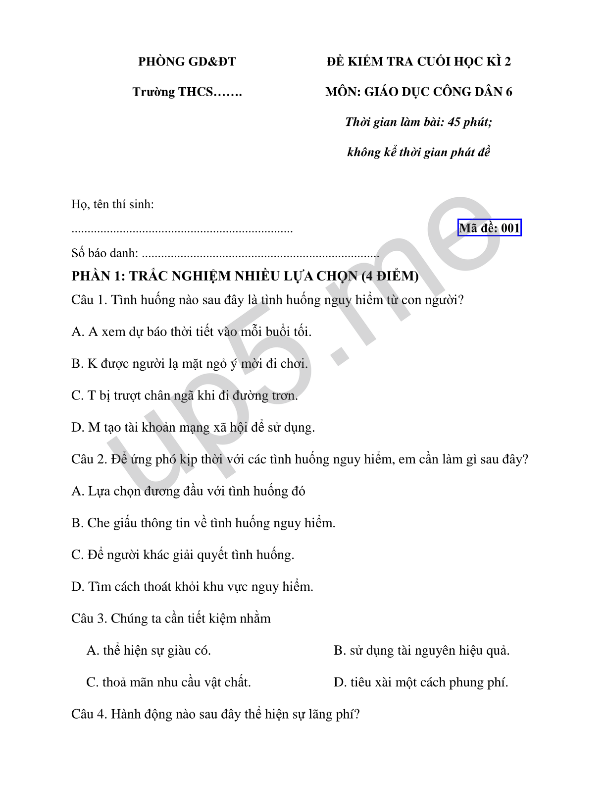 | PHÒNG GD&ĐTTrường THCS……. | ĐỀ KIỂM TRA CUỐI HỌC KÌ 2MÔN: GIÁO DỤC CÔNG DÂN 6Thời gian làm bài: 45 phút; không kể thời gian phát đề |