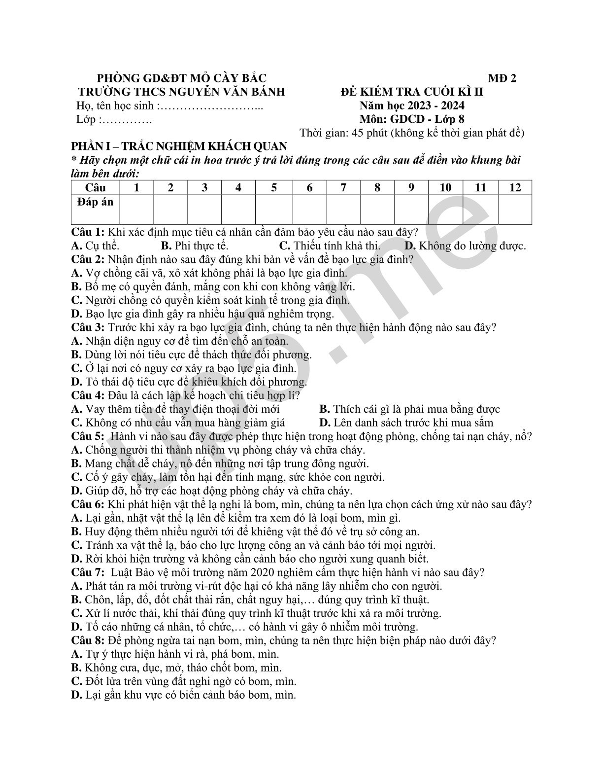 | PHÒNG GD&ĐT MỎ CÀY BẮCTRƯỜNG THCS NGUYỄN VĂN BÁNHHọ, tên học sinh :……………………... Lớp :…………. | MĐ 2ĐỀ KIỂM TRA CUỐI KÌ IINăm học 2023 - 2024Môn: GDCD - Lớp 8Thời gian: 45 phút (không kể thời gian phát đề) |