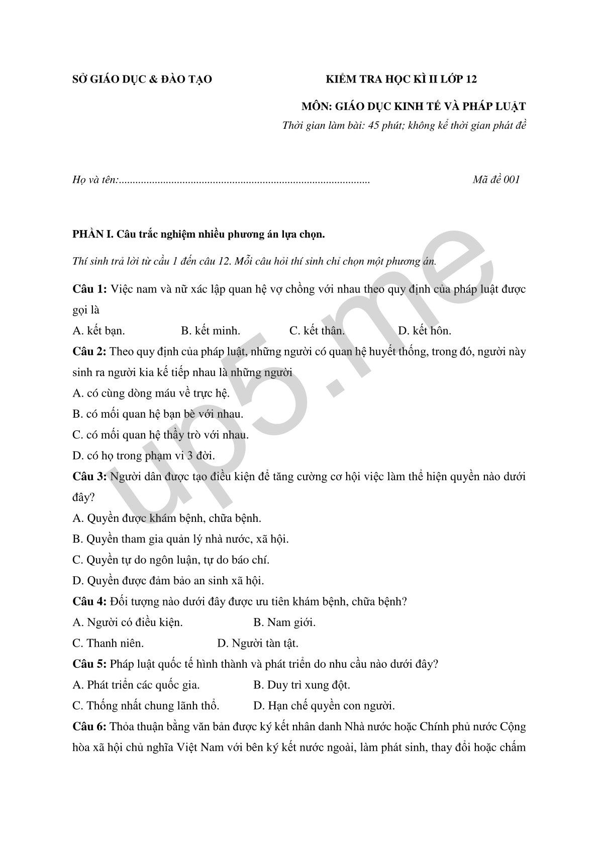 MÔN: GIÁO DỤC KINH TẾ VÀ PHÁP LUẬT Thời gian làm bài: 45 phút; không kể thời gian phát đề