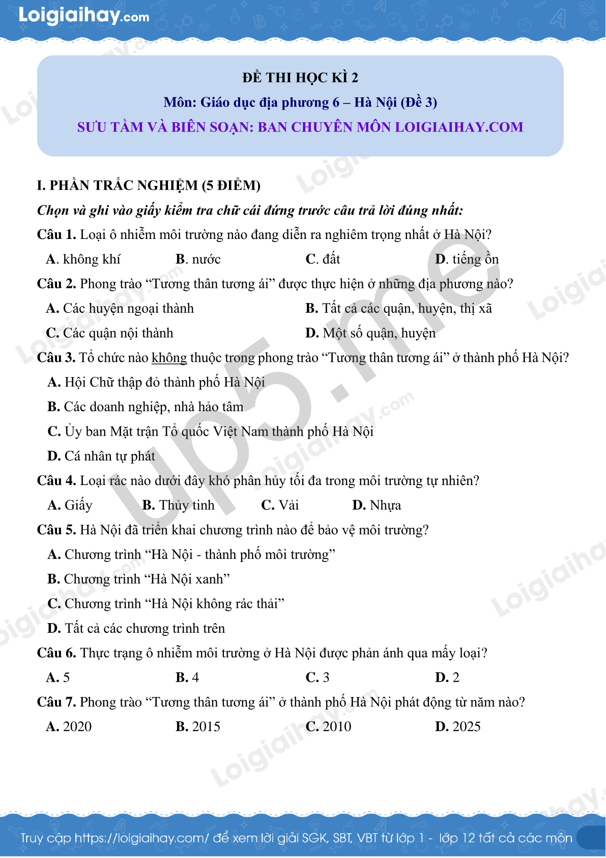 Môn: Giáo dục địa phương 6 – Hà Nội (Đề 3)