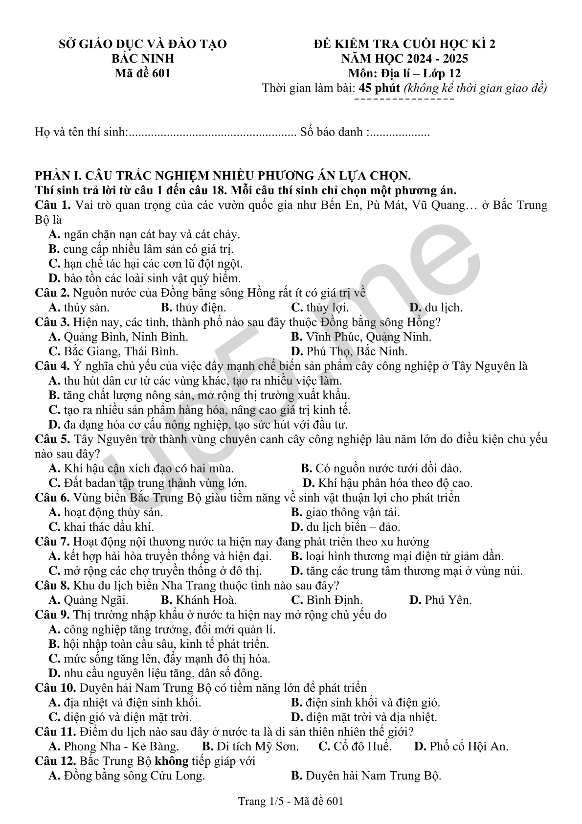 | SỞ GIÁO DỤC VÀ ĐÀO TẠOBẮC NINHMã đề 601 | ĐỀ KIỂM TRA CUỐI HỌC KÌ 2NĂM HỌC 2024 - 2025Môn: Địa lí – Lớp 12Thời gian làm bài: 45 phút (không kể thời gian giao đề)¯¯¯¯¯¯¯¯¯¯¯¯¯¯¯¯ |
