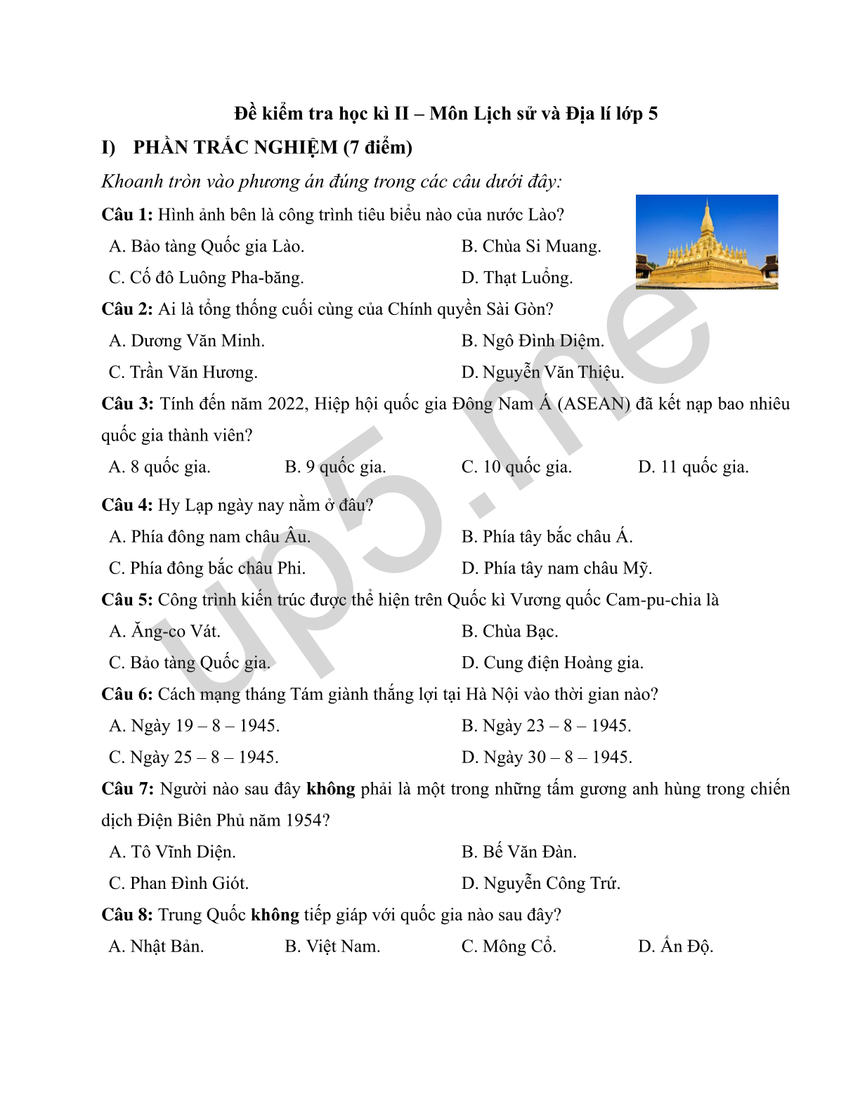 Câu 1: Hình ảnh bên là công trình tiêu biểu nào của nước Lào?