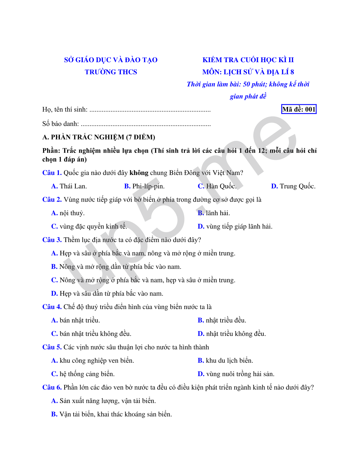 KIỂM TRA CUỐI HỌC KÌ IIMÔN: LỊCH SỬ VÀ ĐỊA LÍ 8Thời gian làm bài: 50 phút; không kể thời gian phát đề |