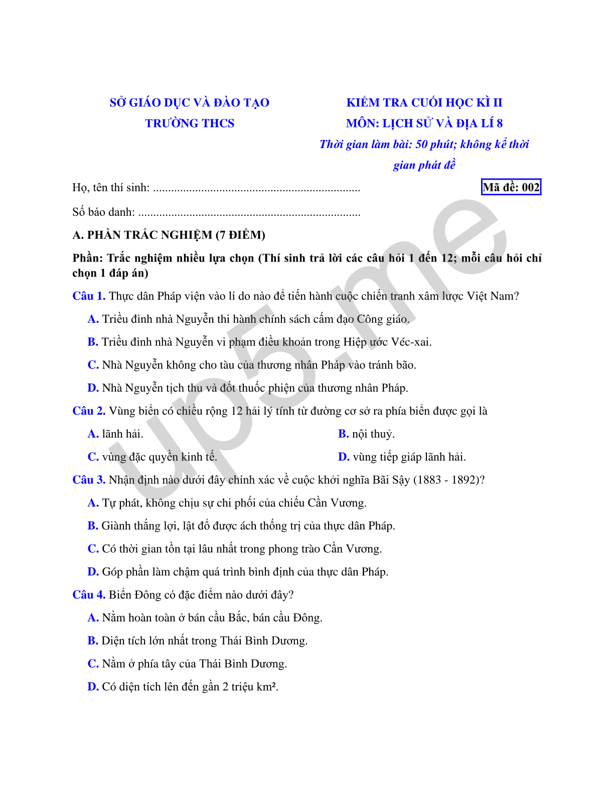 SỞ GIÁO DỤC VÀ ĐÀO TẠOTRƯỜNG THCS Mã đề: 002 |
