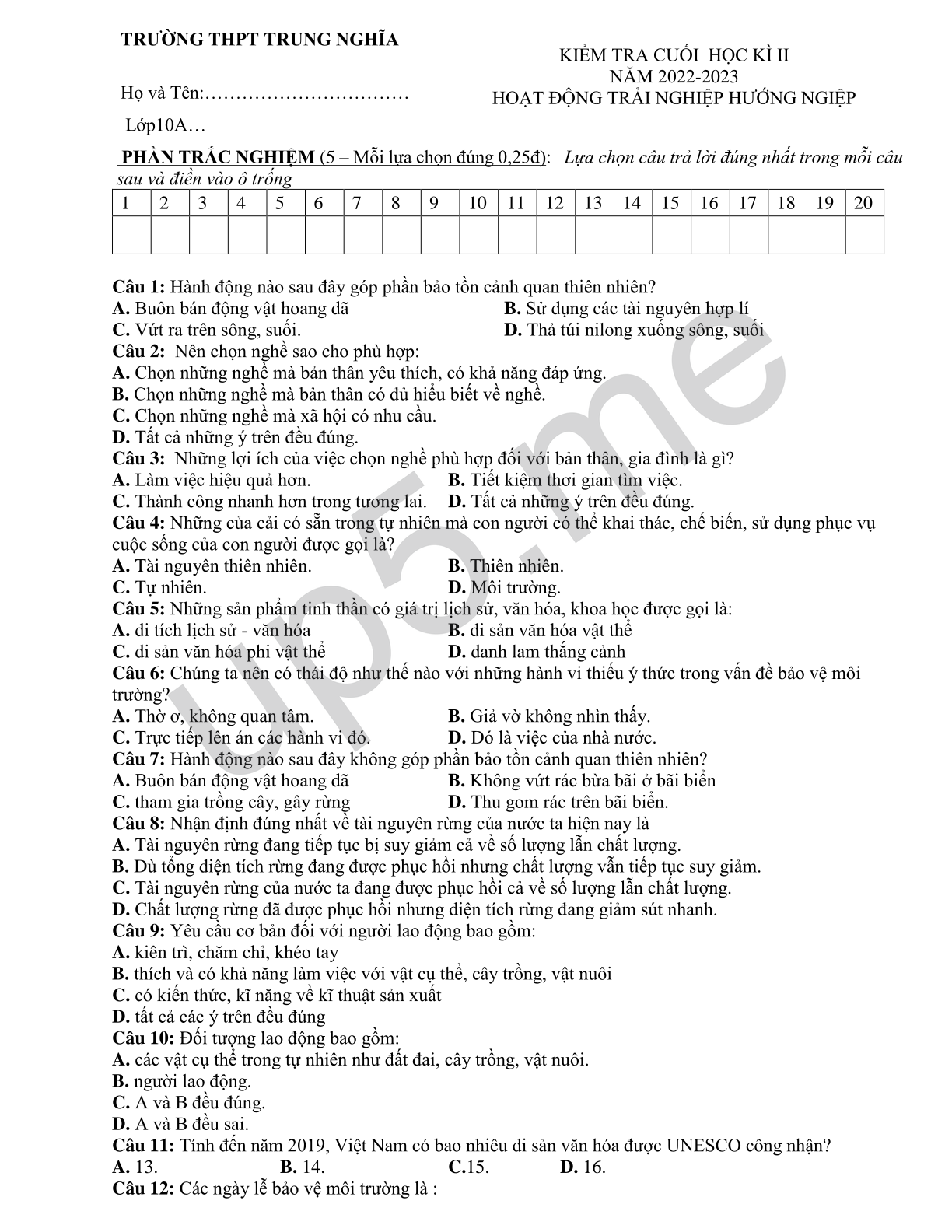 | TRƯỜNG THPT TRUNG NGHĨAHọ và Tên:…………………………… Lớp10A… | KIỂM TRA CUỐI HỌC KÌ IINĂM 2022-2023HOẠT ĐỘNG TRẢI NGHIỆP HƯỚNG NGIỆP |