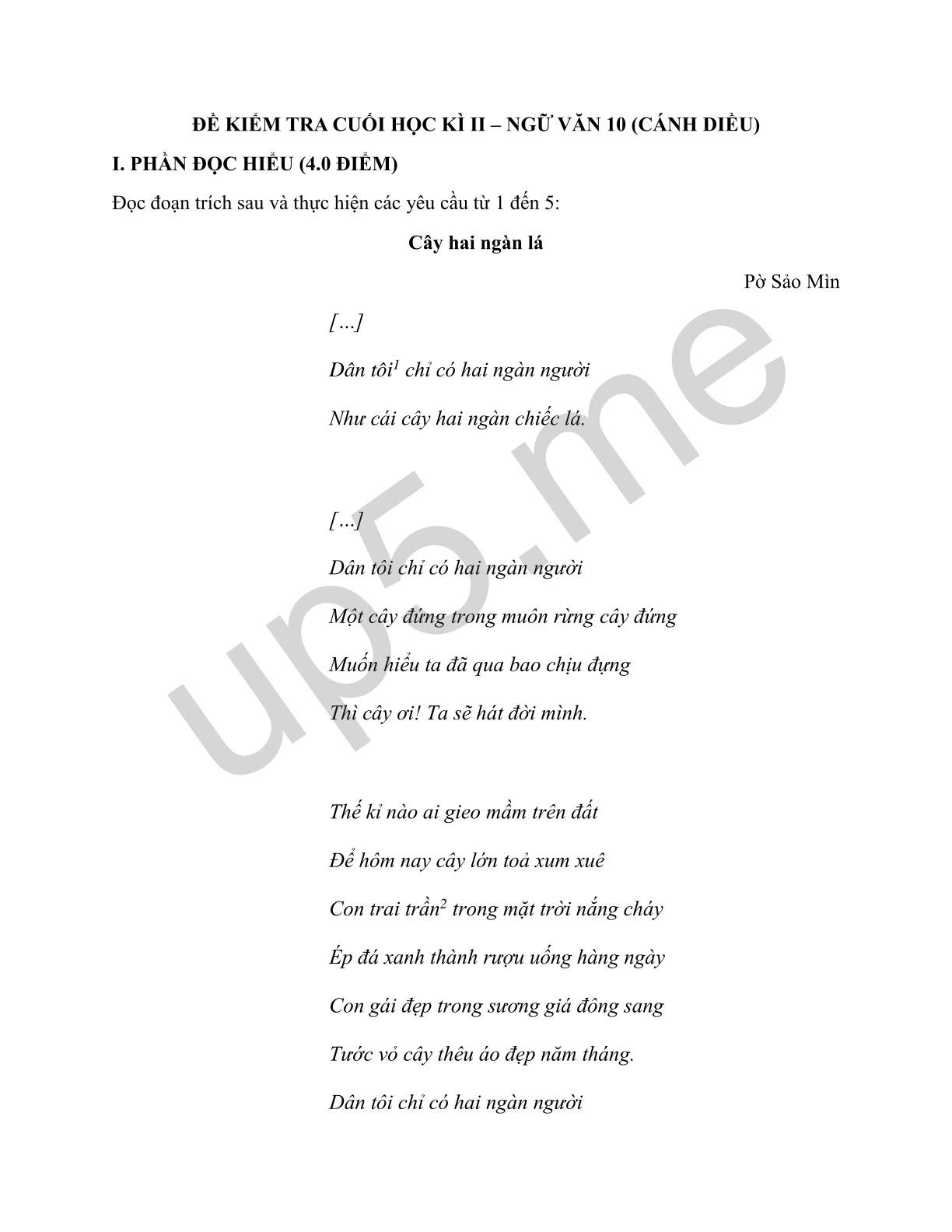 ĐỀ KIỂM TRA CUỐI HỌC KÌ II – NGỮ VĂN 10 (CÁNH DIỀU)