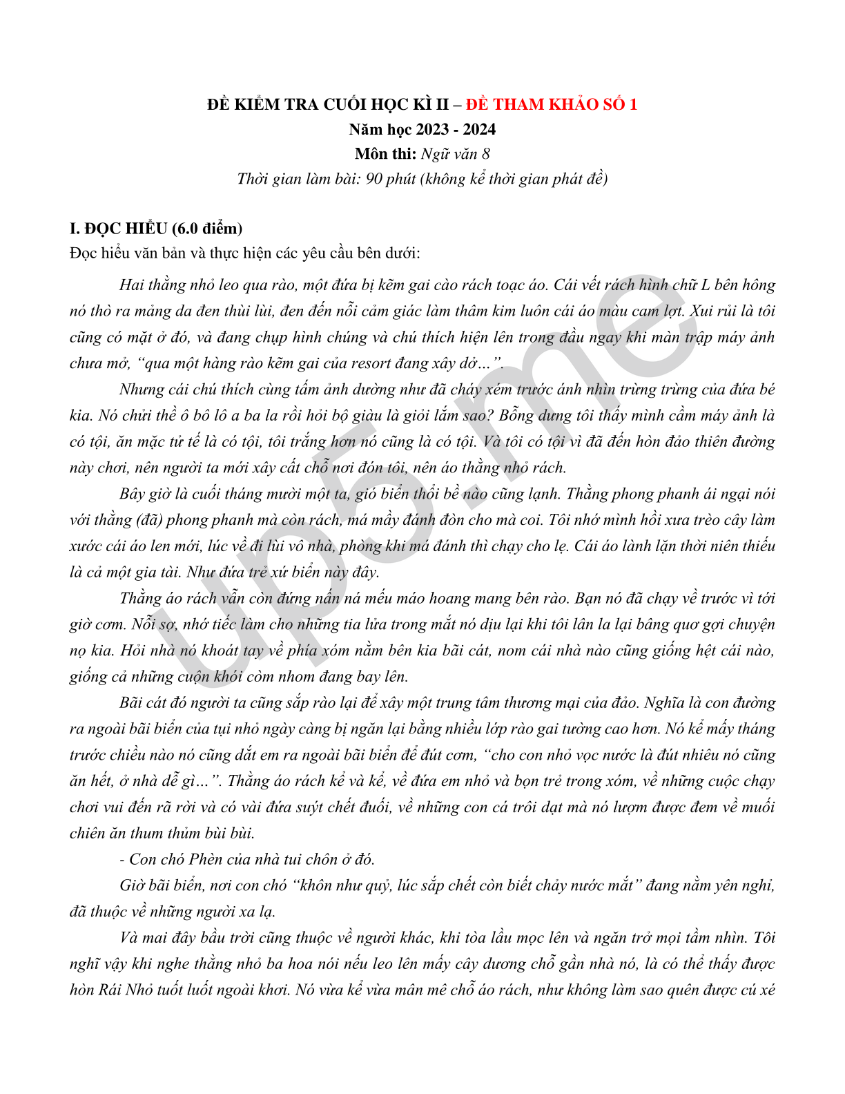 | Môn thi: Ngữ văn 8Thời gian làm bài: 90 phút (không kể thời gian phát đề) |