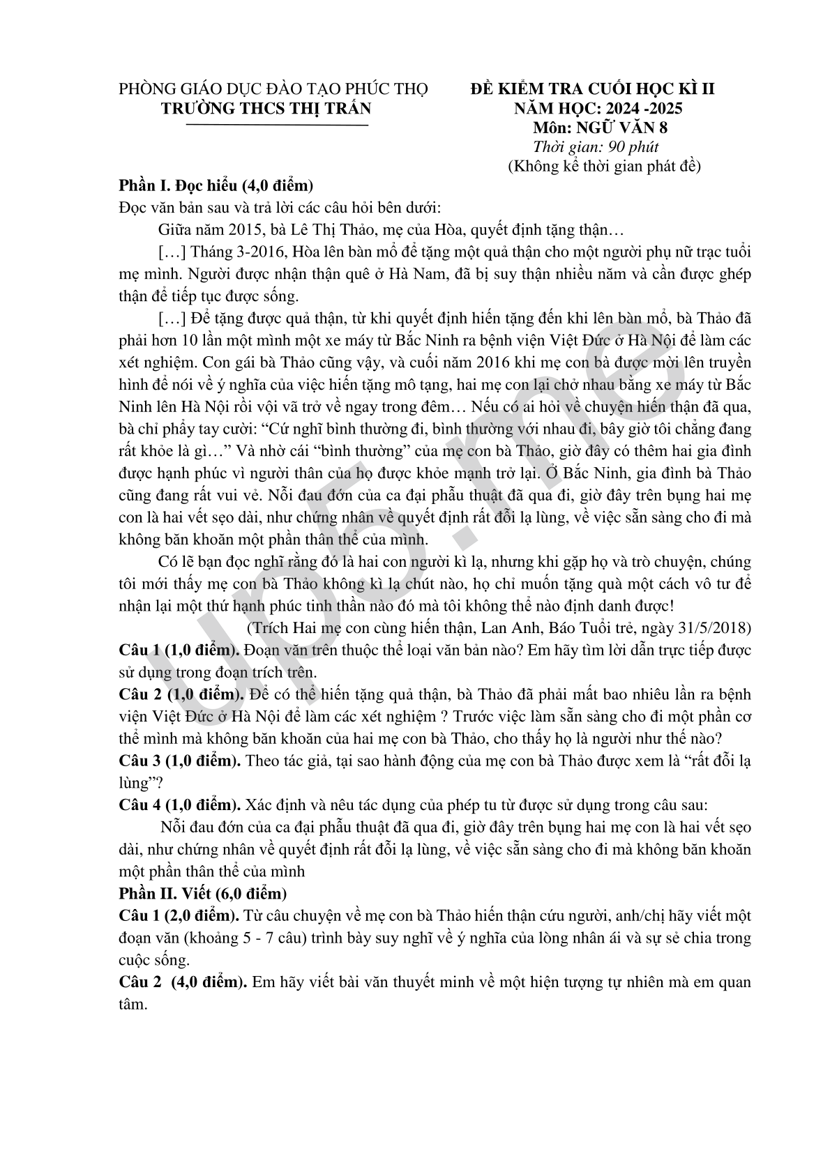 PHÒNG GIÁO DỤC ĐÀO TẠO PHÚC THỌ ĐỀ KIỂM TRA CUỐI HỌC KÌ II
