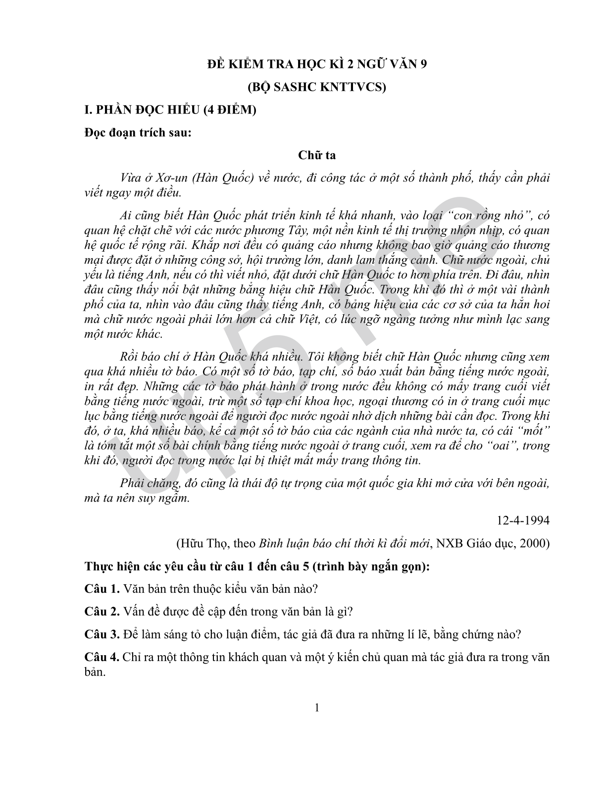 I. PHẦN ĐỌC HIỂU (4 ĐIỂM)