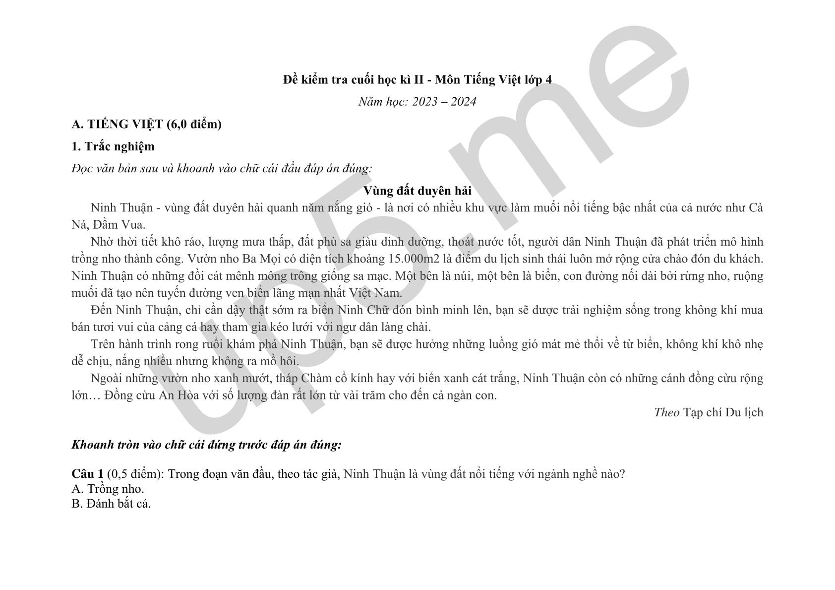 A. TIẾNG VIỆT (6,0 điểm)