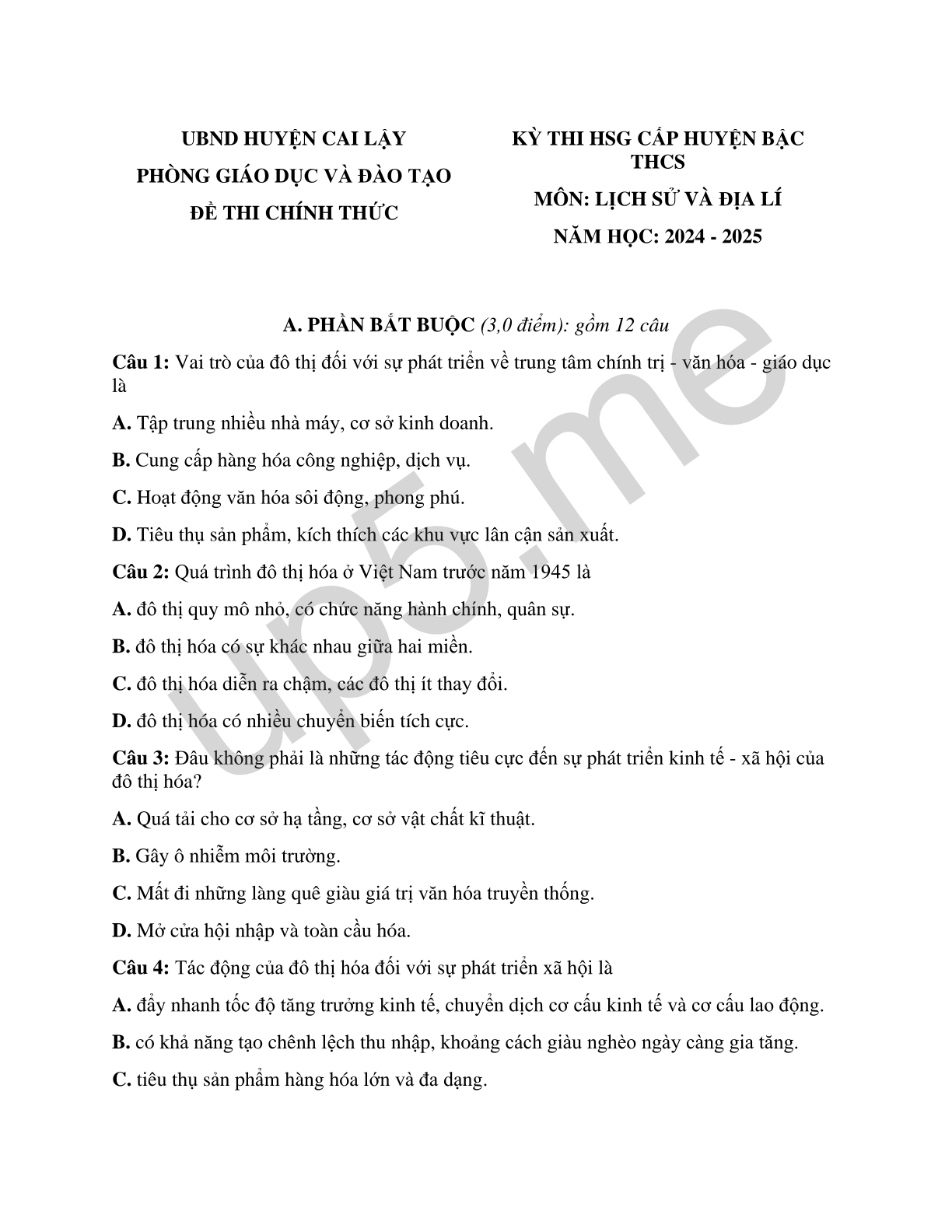 KỲ THI HSG CẤP HUYỆN BẬC THCSMÔN: LỊCH SỬ VÀ ĐỊA LÍNĂM HỌC: 2024 - 2025 |