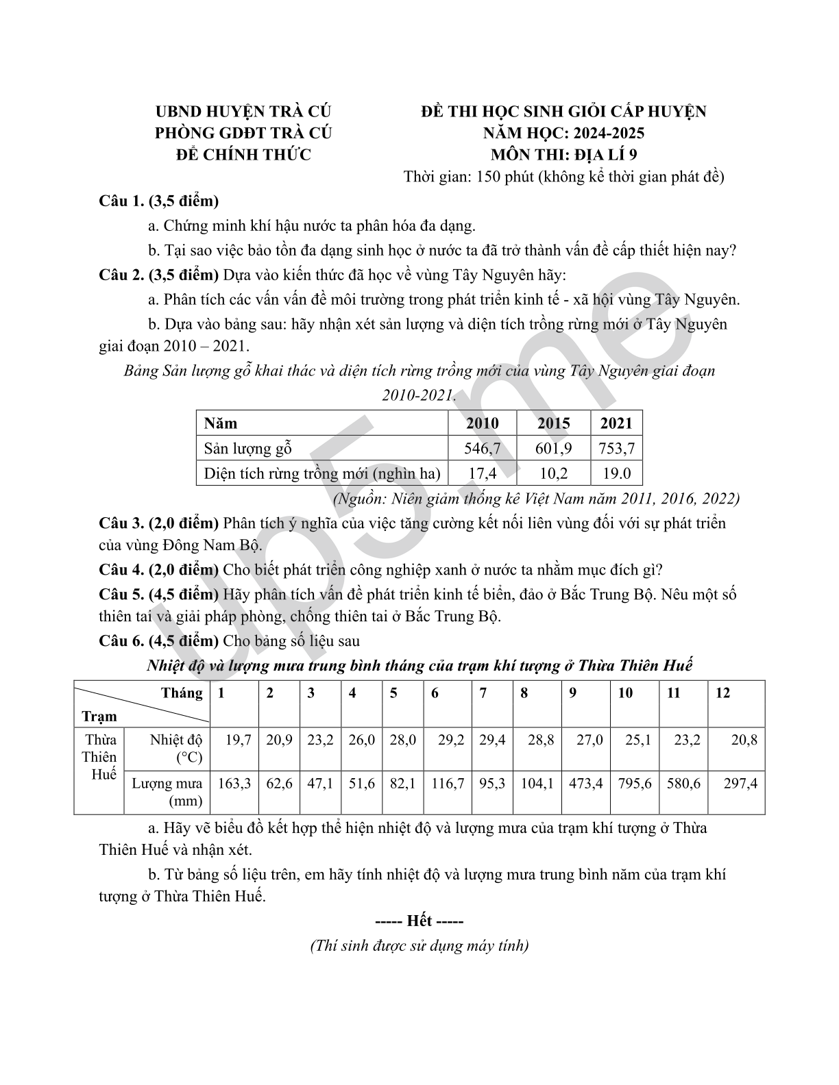 | UBND HUYỆN TRÀ CÚPHÒNG GDĐT TRÀ CÚĐỂ CHÍNH THỨC | ĐỀ THI HỌC SINH GIỎI CẤP HUYỆNNĂM HỌC: 2024-2025MÔN THI: ĐỊA LÍ 9Thời gian: 150 phút (không kể thời gian phát đề) |