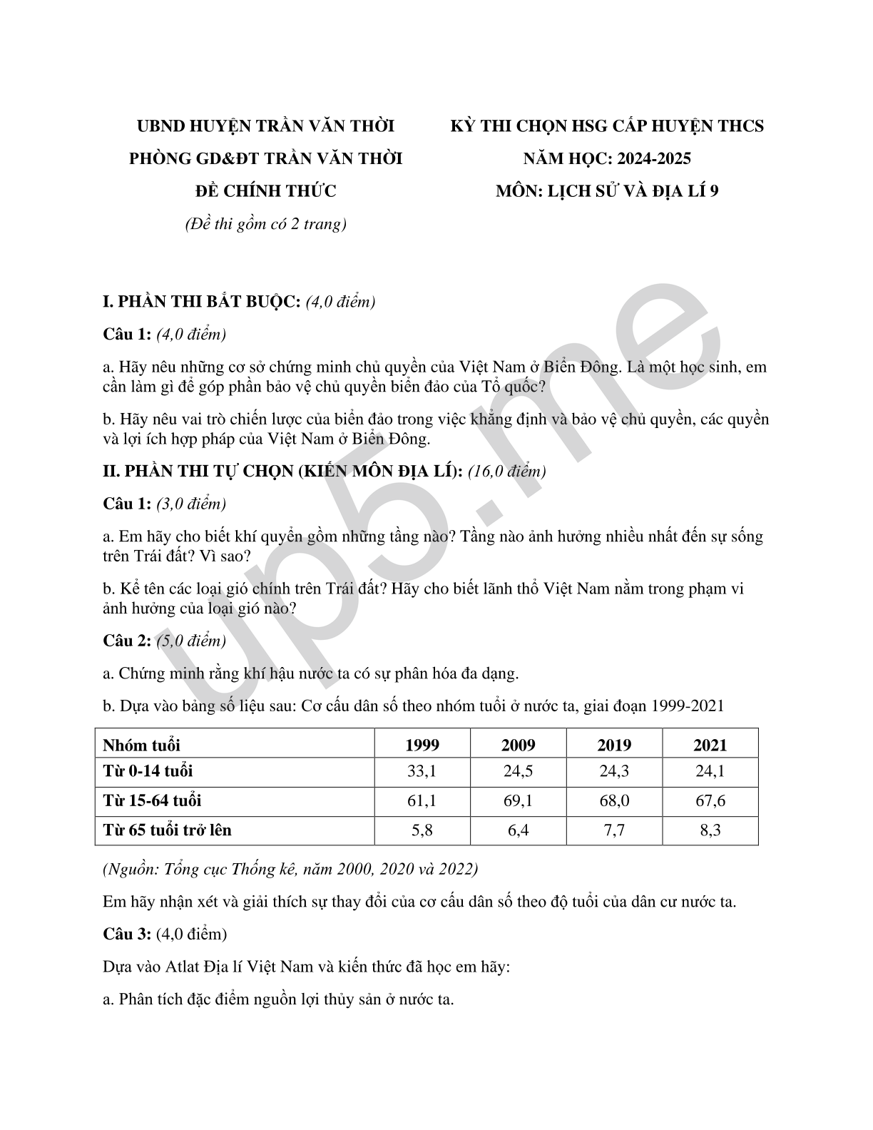 | UBND HUYỆN TRẦN VĂN THỜIPHÒNG GD&ĐT TRẦN VĂN THỜIĐỀ CHÍNH THỨC (Đề thi gồm có 2 trang) | KỲ THI CHỌN HSG CẤP HUYỆN THCSNĂM HỌC: 2024-2025MÔN: LỊCH SỬ VÀ ĐỊA LÍ 9 |