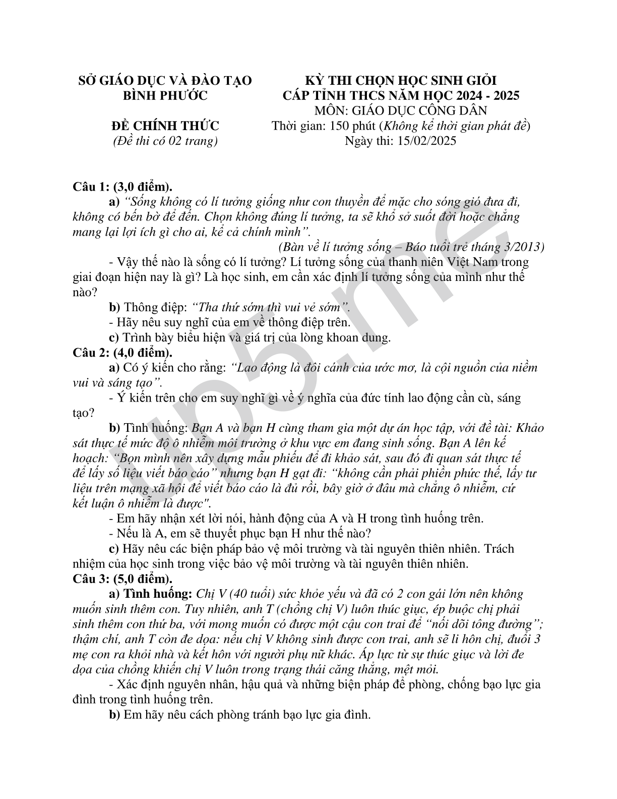 | SỞ GIÁO DỤC VÀ ĐÀO TẠOBÌNH PHƯỚCĐỀ CHÍNH THỨC(Đề thi có 02 trang) | KỲ THI CHỌN HỌC SINH GIỎICÁP TỈNH THCS NĂM HỌC 2024 - 2025MÔN: GIÁO DỤC CÔNG DÂNThời gian: 150 phút (Không kể thời gian phát đề)Ngày thi: 15/02/2025 |