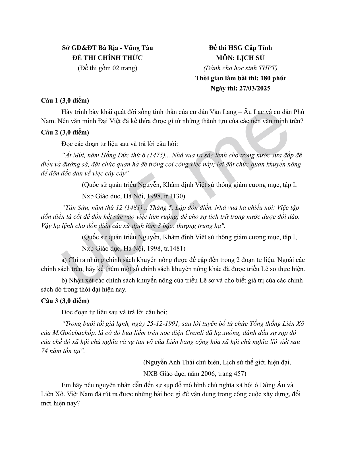 | Sở GD&ĐT Bà Rịa - Vũng TàuĐỀ THI CHÍNH THỨC(Đề thi gồm 02 trang) | Đề thi HSG Cấp TỉnhMÔN: LỊCH SỬ(Dành cho học sinh THPT)Thời gian làm bài thi: 180 phútNgày thi: 27/03/2025 |