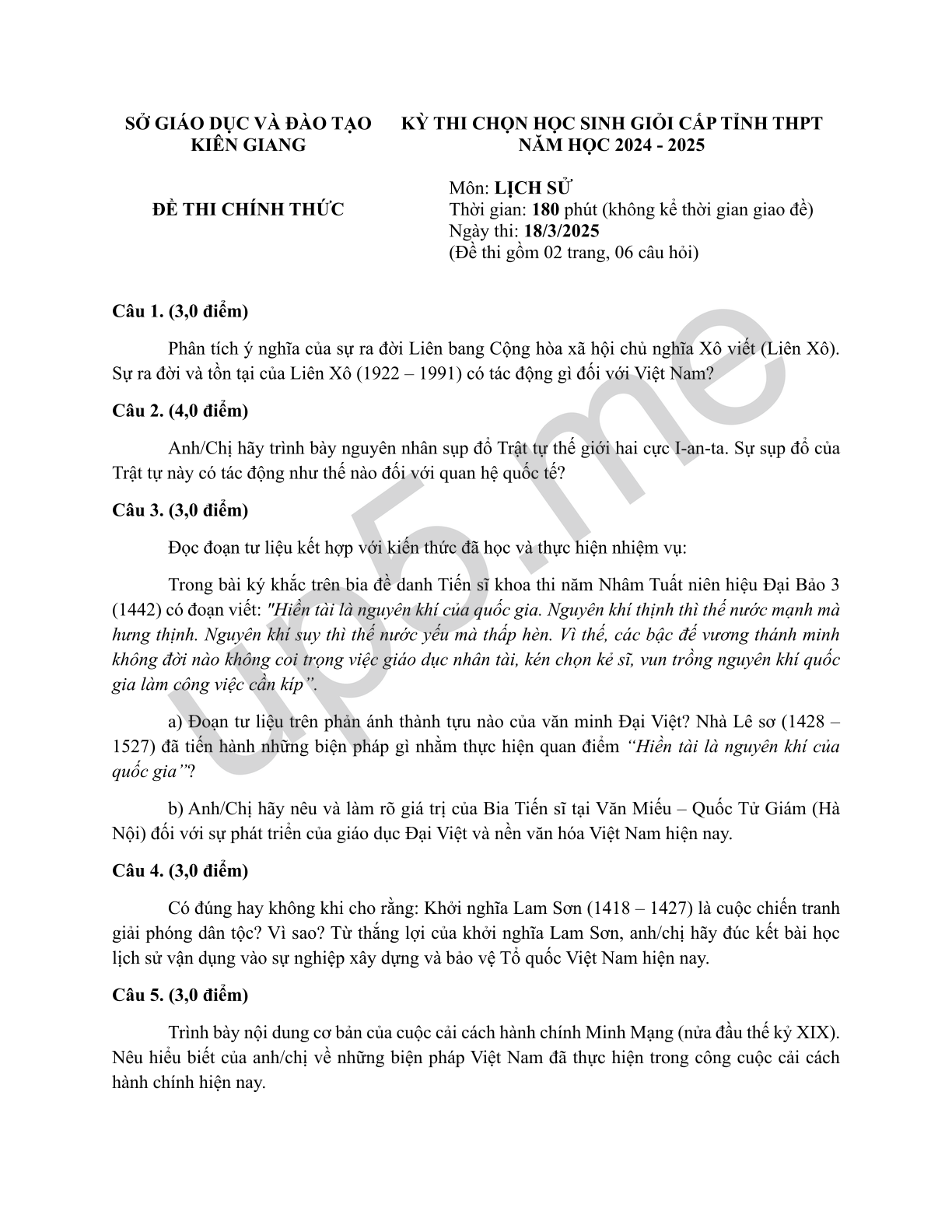 KỲ THI CHỌN HỌC SINH GIỎI CẤP TỈNH THPTNĂM HỌC 2024 - 2025Môn: LỊCH SỬThời gian: 180 phút (không kể thời gian giao đề)Ngày thi: 18/3/2025(Đề thi gồm 02 trang, 06 câu hỏi) |