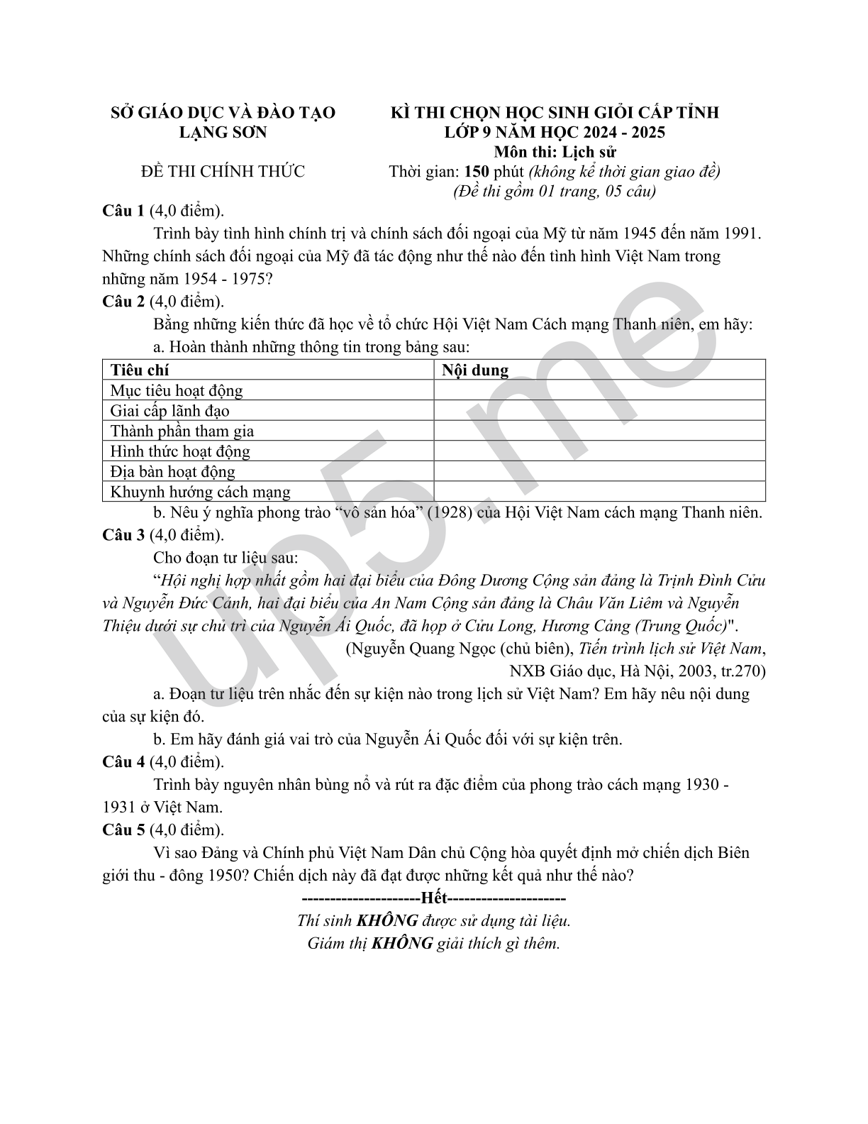 | SỞ GIÁO DỤC VÀ ĐÀO TẠOLẠNG SƠNĐỀ THI CHÍNH THỨC | KÌ THI CHỌN HỌC SINH GIỎI CẤP TỈNHLỚP 9 NĂM HỌC 2024 - 2025Môn thi: Lịch sửThời gian: 150 phút (không kể thời gian giao đề)(Đề thi gồm 01 trang, 05 câu) |