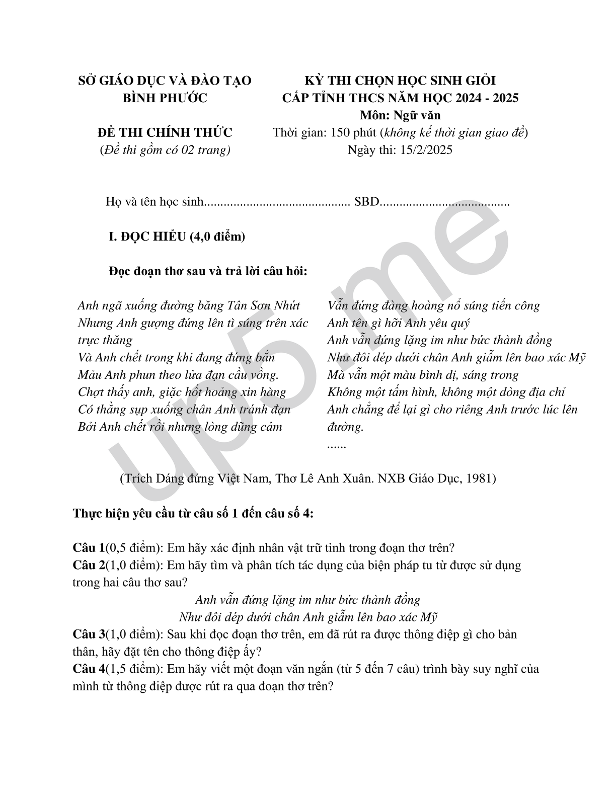 | SỞ GIÁO DỤC VÀ ĐÀO TẠOBÌNH PHƯỚCĐỀ THI CHÍNH THỨC(Đề thi gồm có 02 trang) | KỲ THI CHỌN HỌC SINH GIỎICẤP TỈNH THCS NĂM HỌC 2024 - 2025Môn: Ngữ vănThời gian: 150 phút (không kể thời gian giao đề)Ngày thi: 15/2/2025 |