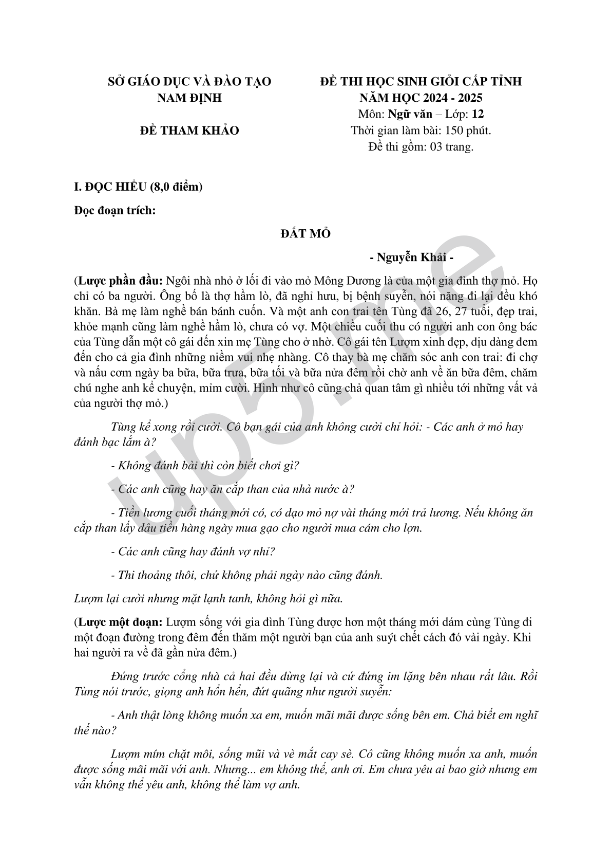ĐỀ THI HỌC SINH GIỎI CẤP TỈNH NĂM HỌC 2024 - 2025 Môn: Ngữ văn – Lớp: 12 Thời gian làm bài: 150 phút. Đề thi gồm: 03 trang. |