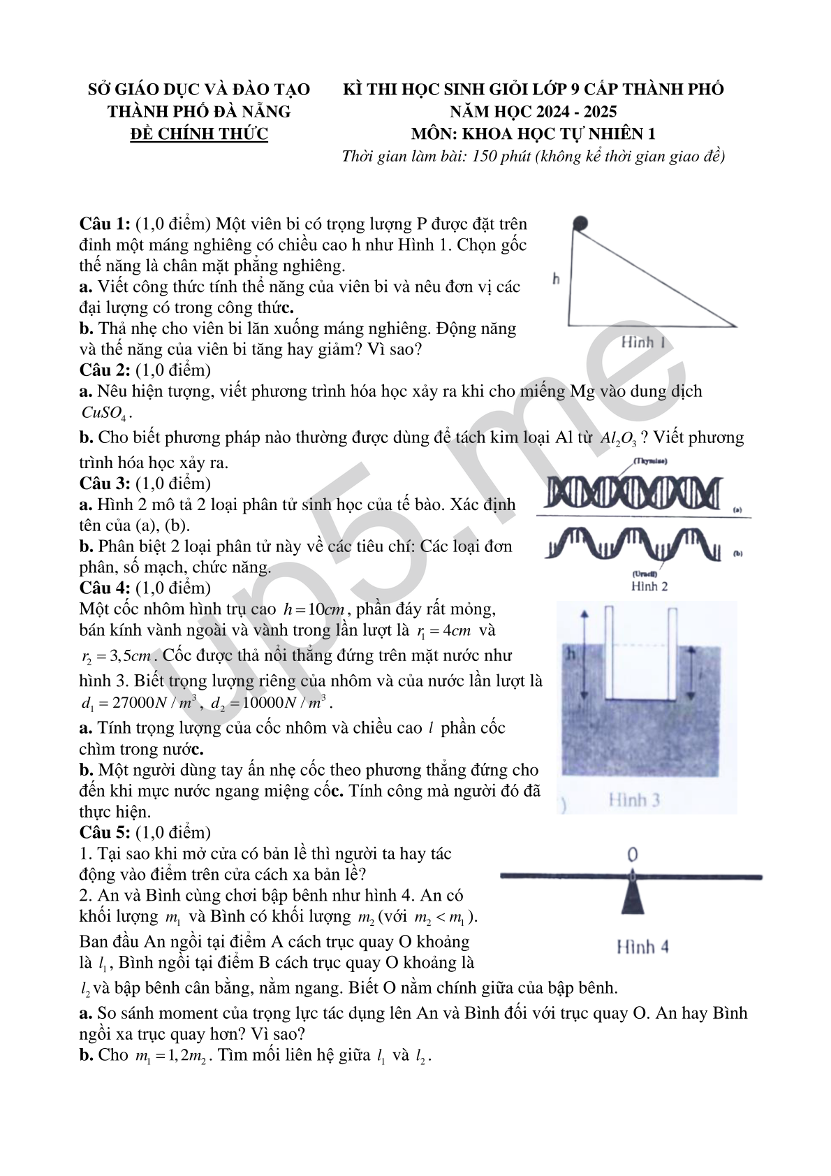 KÌ THI HỌC SINH GIỎI LỚP 9 CẤP THÀNH PHỐ NĂM HỌC 2024 - 2025 MÔN: KHOA HỌC TỰ NHIÊN 1 Thời gian làm bài: 150 phút (không kể thời gian giao đề) |