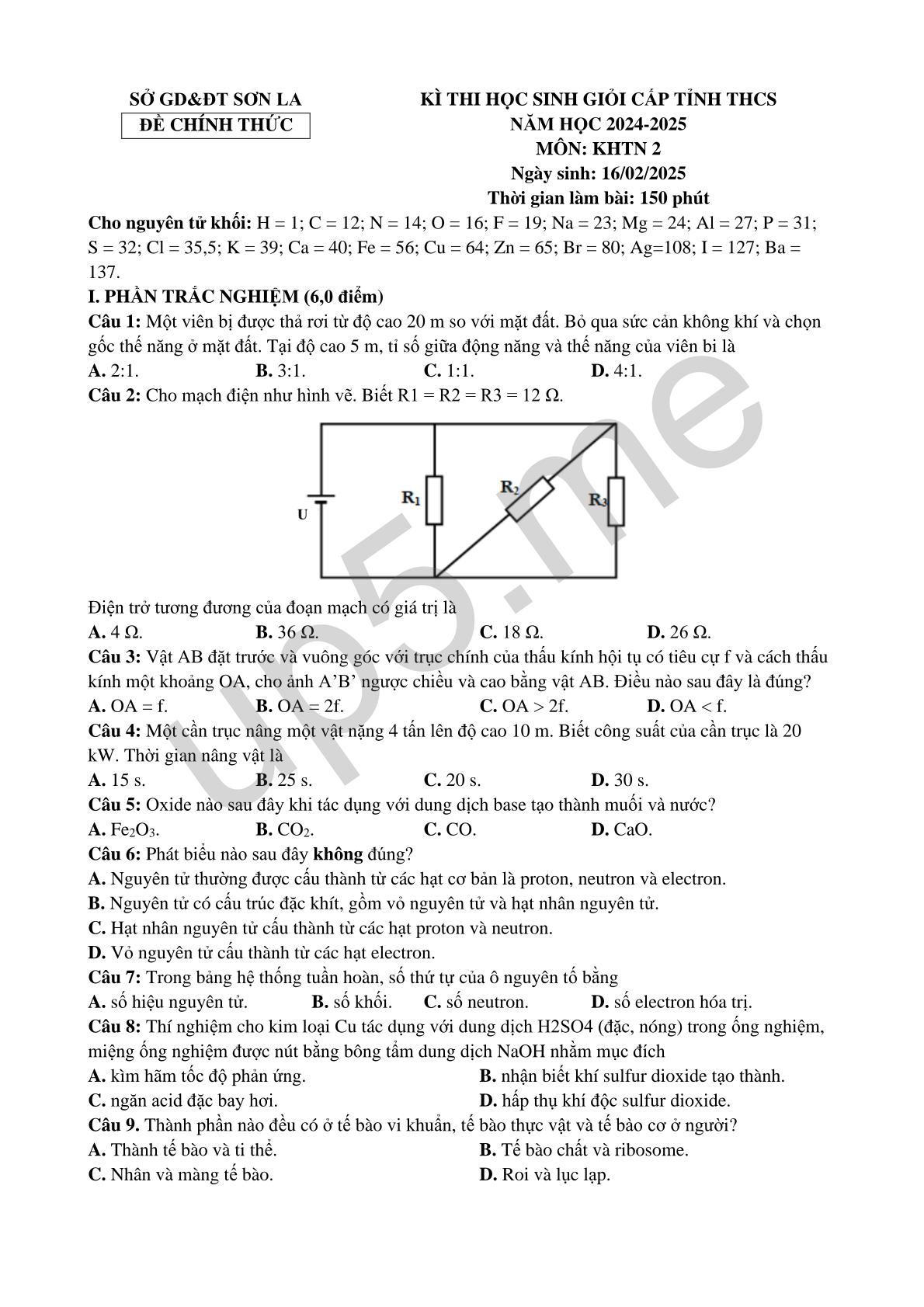 KÌ THI HỌC SINH GIỎI CẤP TỈNH THCSNĂM HỌC 2024-2025MÔN: KHTN 2Ngày sinh: 16/02/2025Thời gian làm bài: 150 phút |