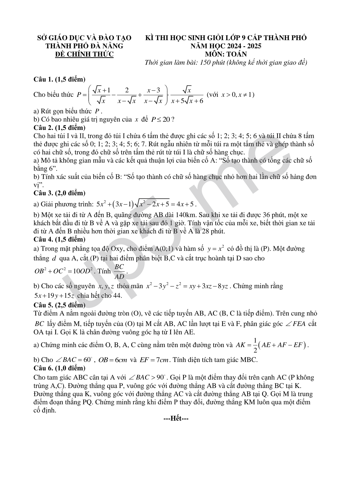 KÌ THI HỌC SINH GIỎI LỚP 9 CẤP THÀNH PHỐ NĂM HỌC 2024 - 2025 MÔN: TOÁN Thời gian làm bài: 150 phút (không kể thời gian giao đề) |