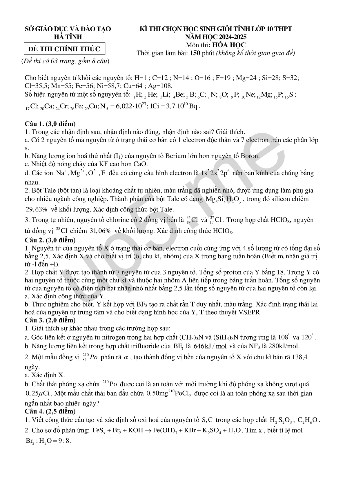 | SỞ GIÁO DỤC VÀ ĐÀO TẠOHÀ TĨNHĐỀ THI CHÍNH THỨC (Đề thi có 03 trang, gồm 8 câu) | KÌ THI CHỌN HỌC SINH GIỎI TỈNH LỚP 10 THPT NĂM HỌC 2024-2025Môn thi: HÓA HỌCThời gian làm bài: 150 phút (không kể thời gian giao đề) |
