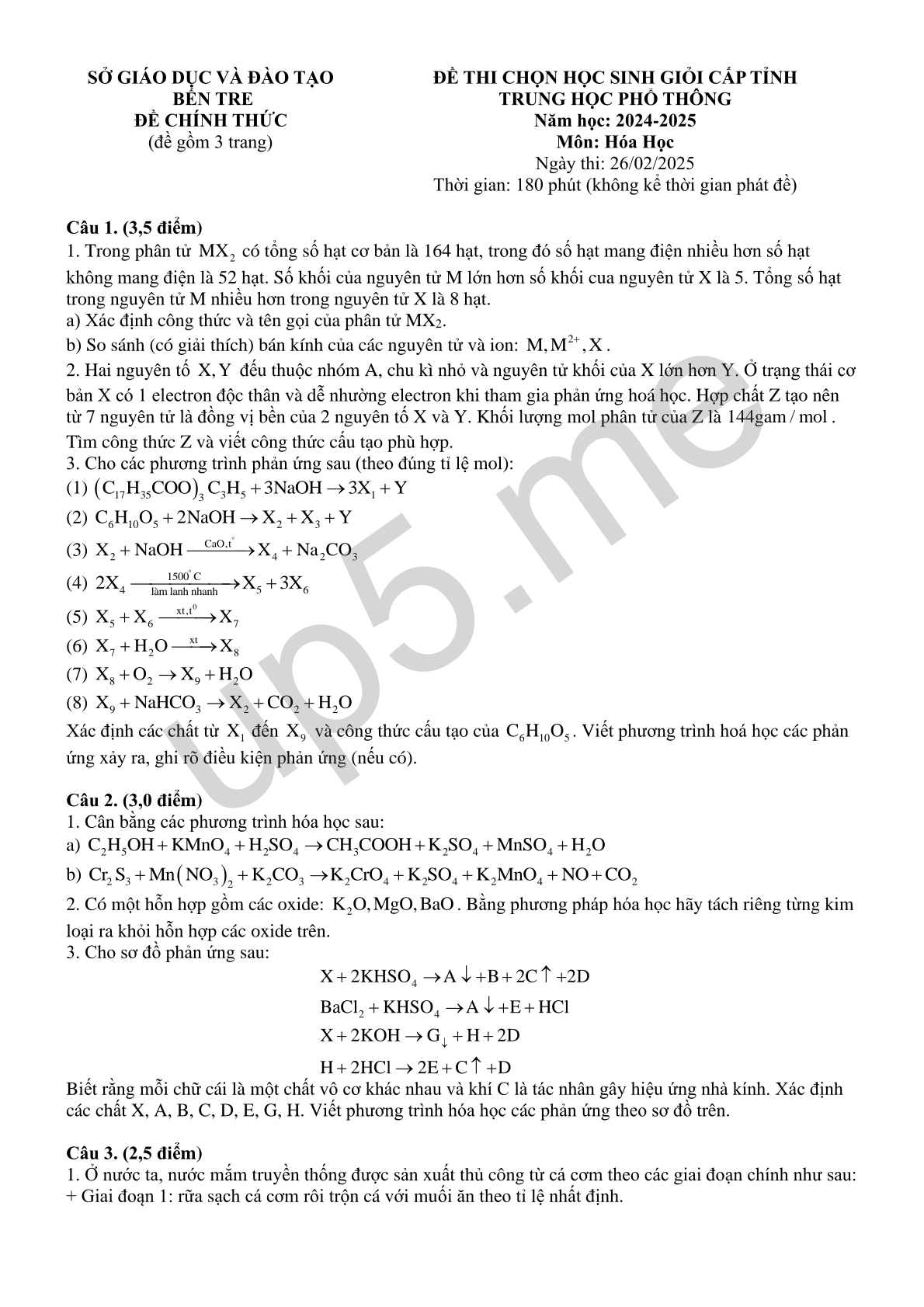 | SỞ GIÁO DỤC VÀ ĐÀO TẠO BẾN TREĐỀ CHÍNH THỨC(đề gồm 3 trang) | ĐỀ THI CHỌN HỌC SINH GIỎI CẤP TỈNHTRUNG HỌC PHỔ THÔNGNăm học: 2024-2025Môn: Hóa HọcNgày thi: 26/02/2025Thời gian: 180 phút (không kể thời gian phát đề) |